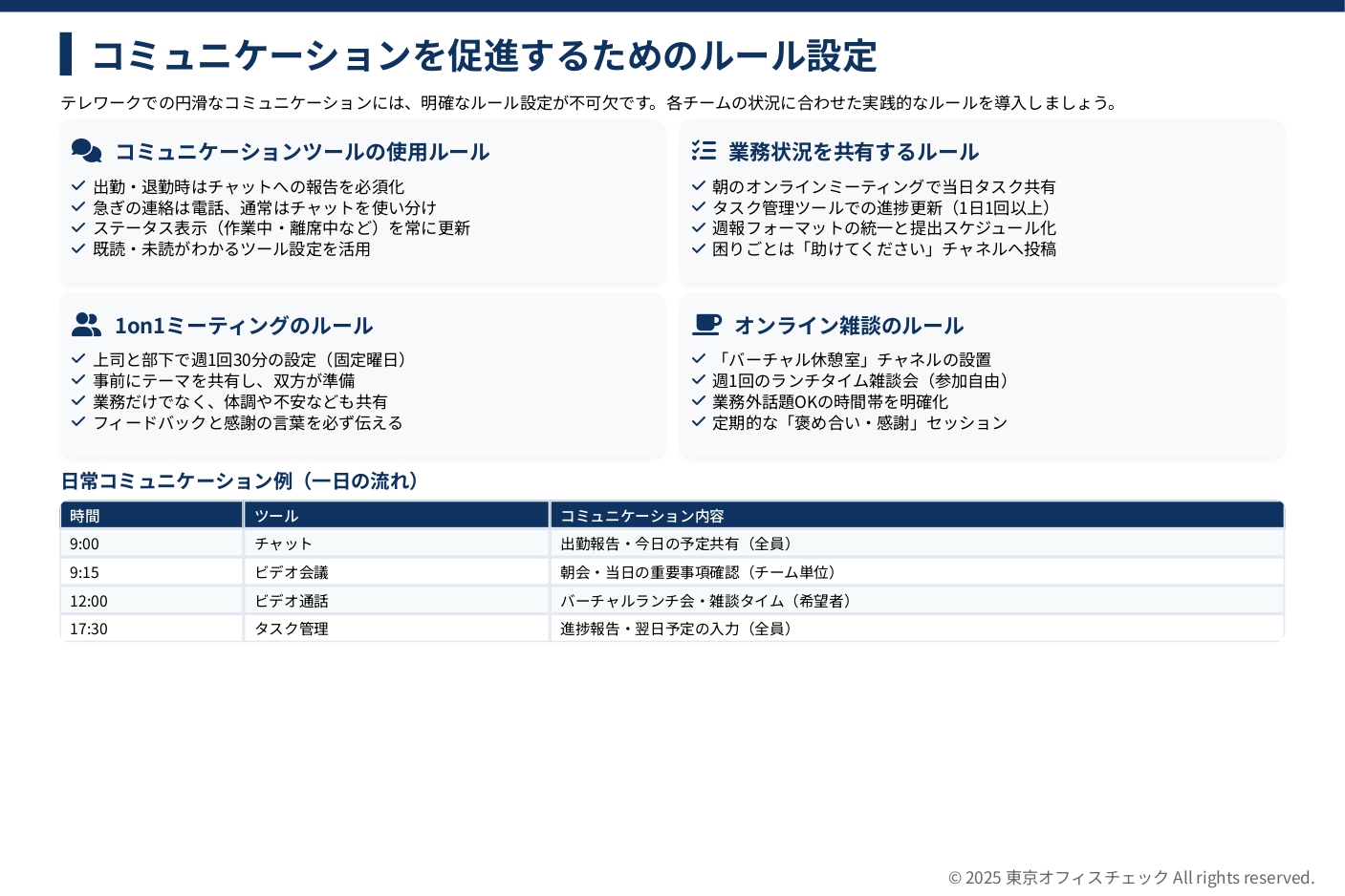 円滑なコミュニケーションには、業務状況の共有やツール運用など明確なルール設定が不可欠です。