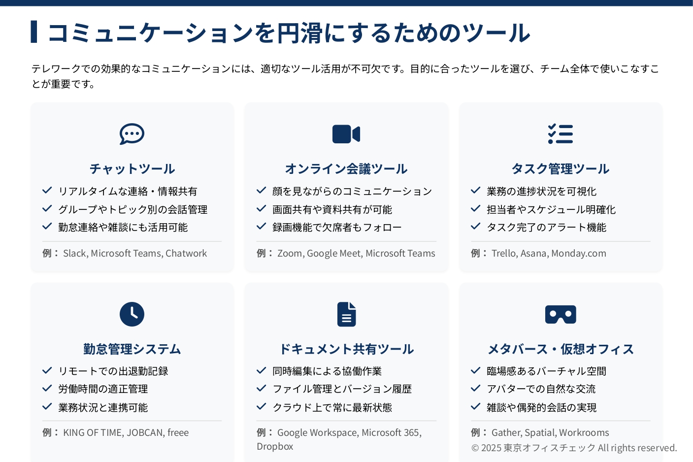 テレワークでのコミュニケーションが円滑に行えず、業務状況の共有や勤怠管理、孤独の悩みなどで不安に感じている方は多いのではないでしょうか。チーム連携やコミュニケーションツールの使い方など、オフィス仕様の変更を検討する際にも気になる点がたくさんあります。本記事では、テレワークにおけるコミュニケーションの課題や解決方法、ツール選び、心理的安全性の確保方法まで詳しく解説します。この記事を読むことで、生産性や社員満足度の向上につながる知識が得られます。