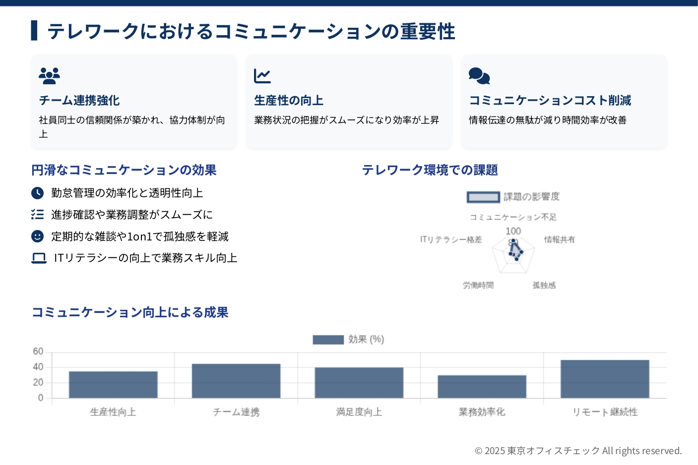テレワーク環境ではコミュニケーション不足や労働時間の長さが生産性やチーム連携に影響するため、その重要性はますます高まっています。