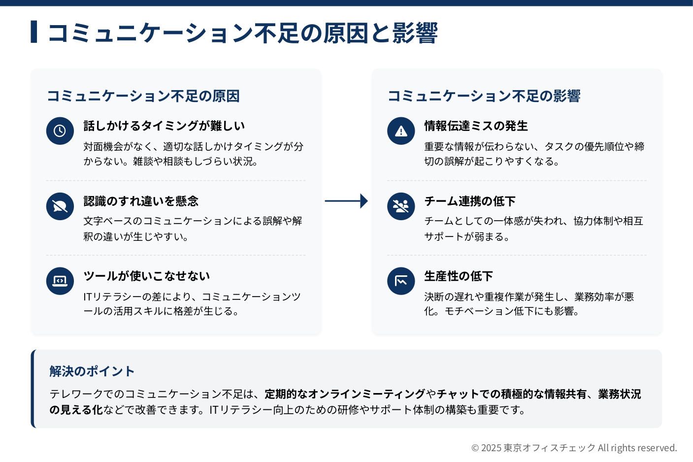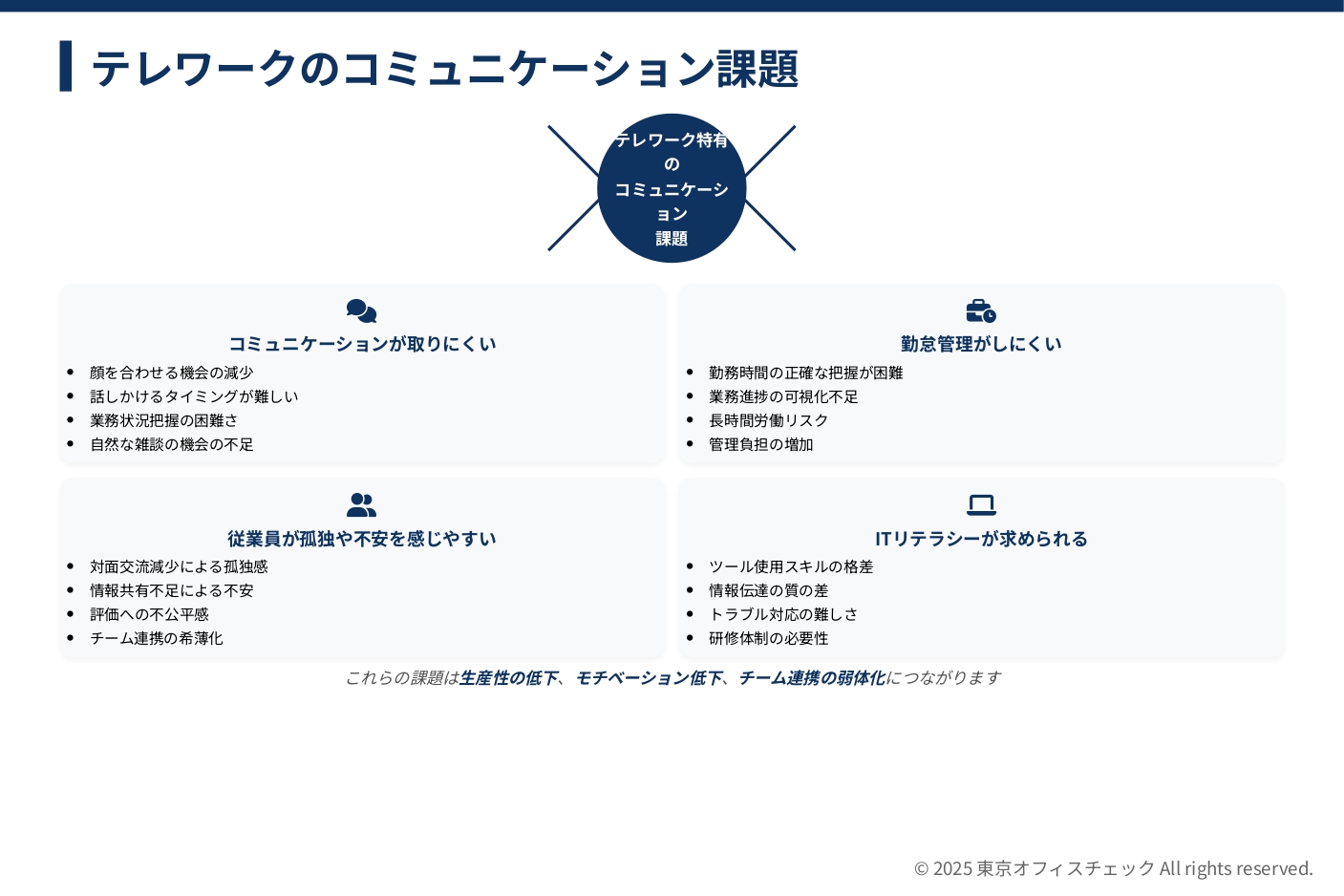 テレワークでは話しかけるタイミングや情報共有の難しさ、孤独やITリテラシーの格差など多くの課題が生じます。