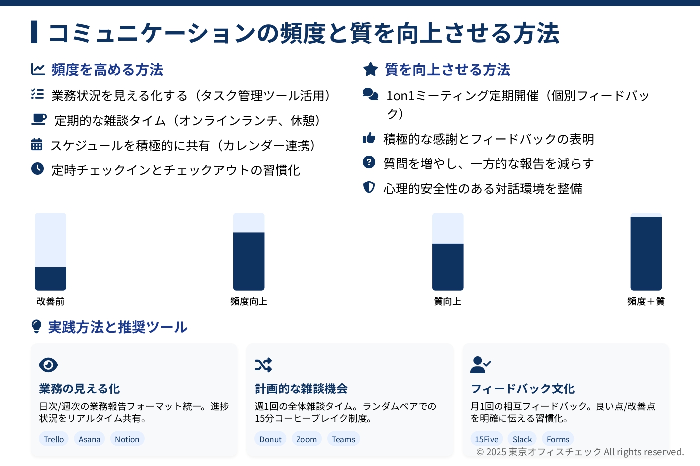 業務状況の見える化や雑談の取り入れ、スケジュール共有が頻度と質の向上に役立ちます。
