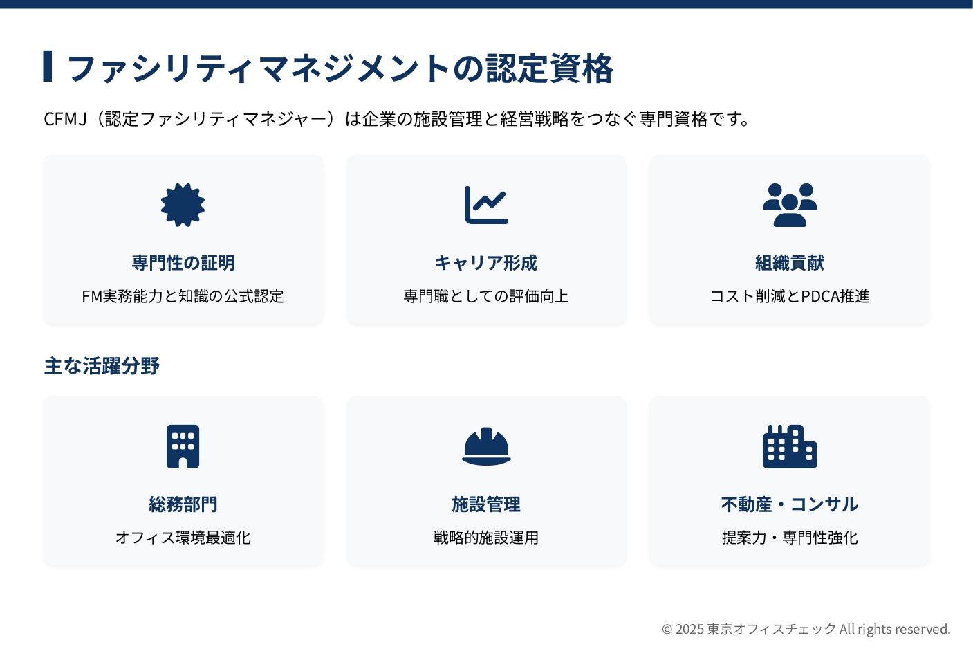 認定ファシリティマネジャー(CFMJ)は、ファシリティマネジメントの専門知識と実務能力を認める資格です。取得には専門的な研修・試験が必要となります。