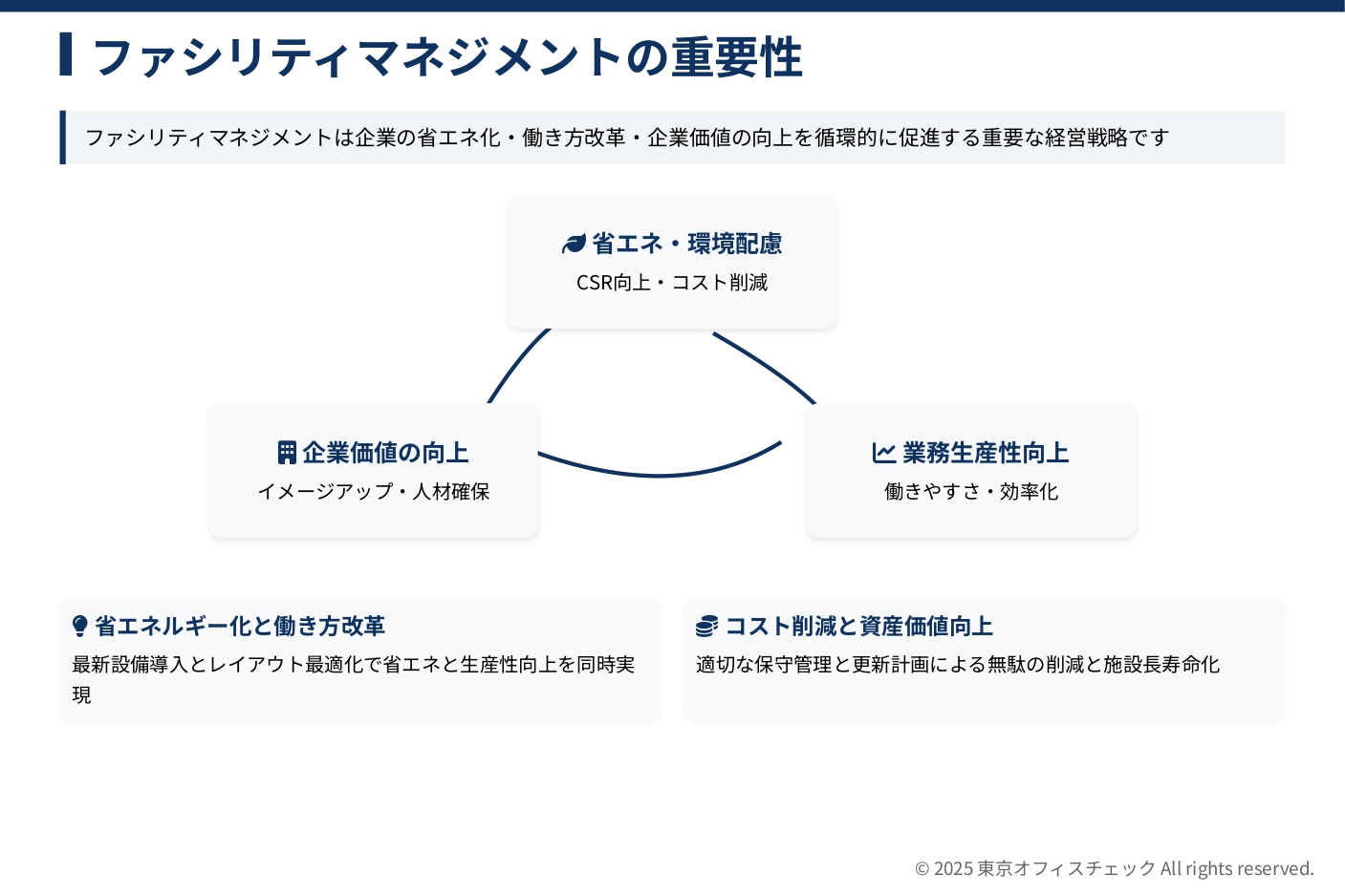 加えて、環境配慮や働きやすい空間づくりなど、プロパティマネジメントの要素も取り入れ進化していることが特徴です。単なる管理にとどまらず、企業活動全体の価値向上につながります。