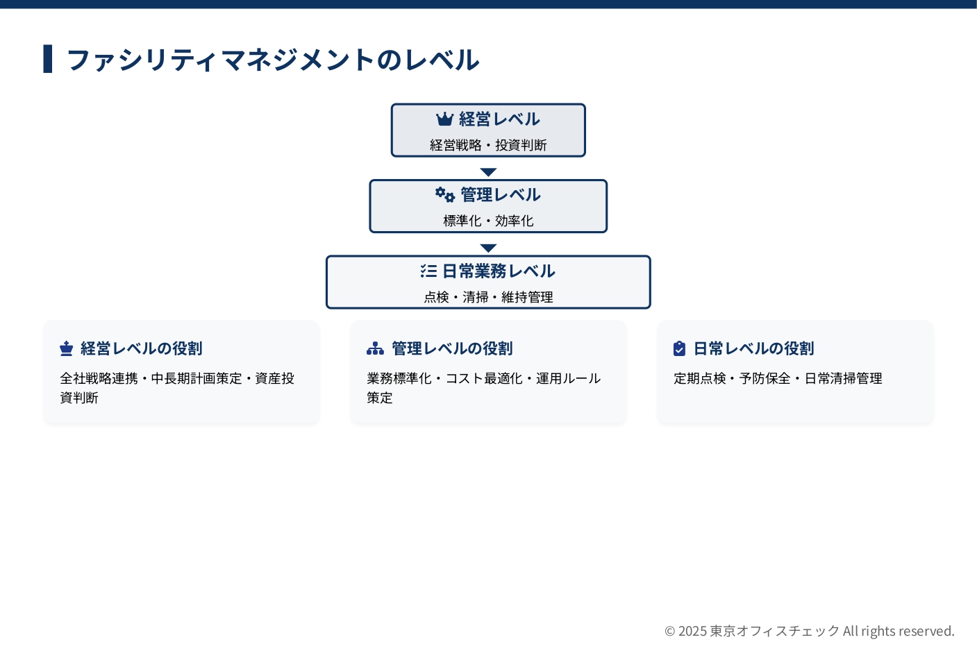 経営レベルでのファシリティマネジメントは、固定資産の戦略的な活用や将来の投資判断を含みます。経営層がLCC(ライフサイクルコスト)や企業全体のCSR目標達成を意識した方針を示すことが重要です。