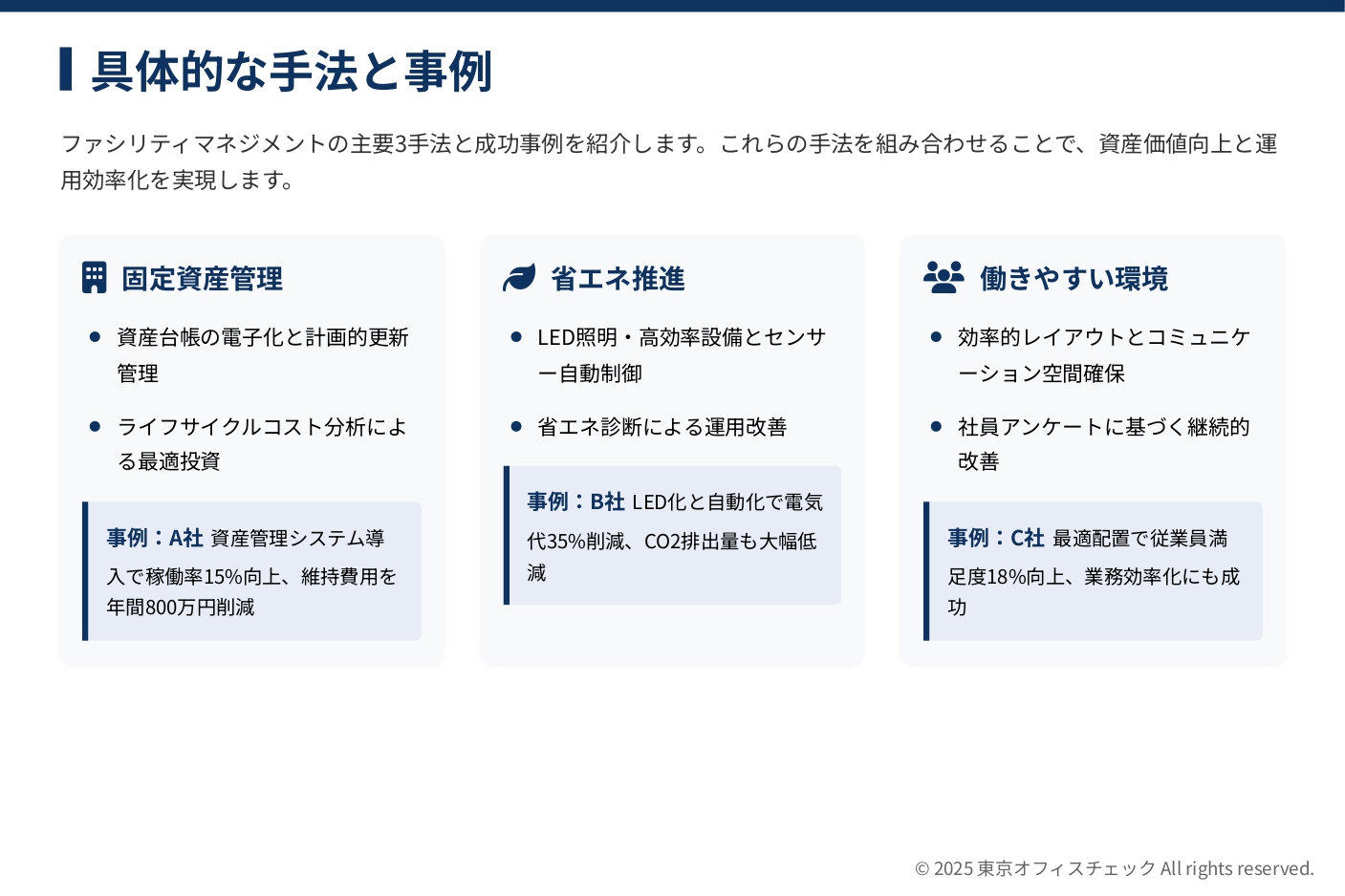 こうした手法は、施設管理者や総務部門の負担軽減だけでなく、企業の資産価値向上につながります。