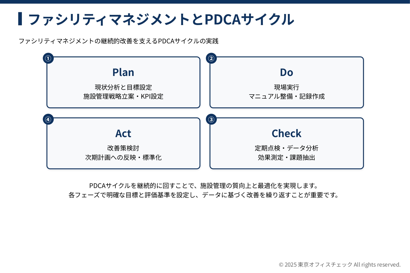 このサイクルを繰り返すことで、施設管理だけでなく企業全体の業務効率と資産価値向上に貢献します。