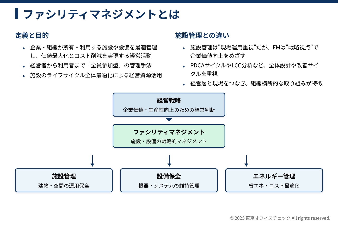 施設管理では設備管理、清掃、設備の統括、顧客との折衝などが日常業務の中心ですが、ファシリティマネジメントは総務や経営層が関与し、LCC視点のコスト削減やPDCAサイクルによる継続的な改善を目指します。