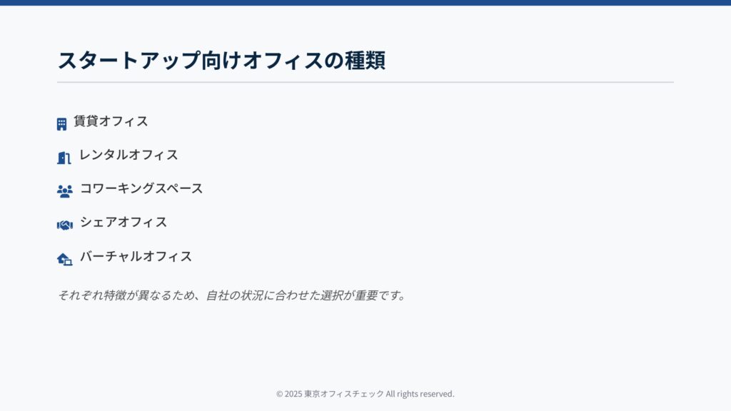 スタートアップ向けのオフィスには、さまざまな選択肢があります。自社のニーズに合ったオフィス環境を選ぶことが重要です。