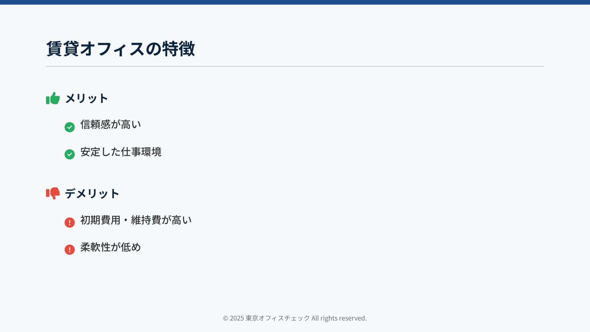 しかし、賃貸オフィスにはデメリットもあります。まず、契約期間が2~3年であり、借主のタイミングで中途解約が可能なため、柔軟性があります。また、家賃や敷金などの初期費用が高額であり、資金に余裕のないスタートアップ企業には負担が大きいです。さらに、オフィスの維持管理には時間とコストがかかります。