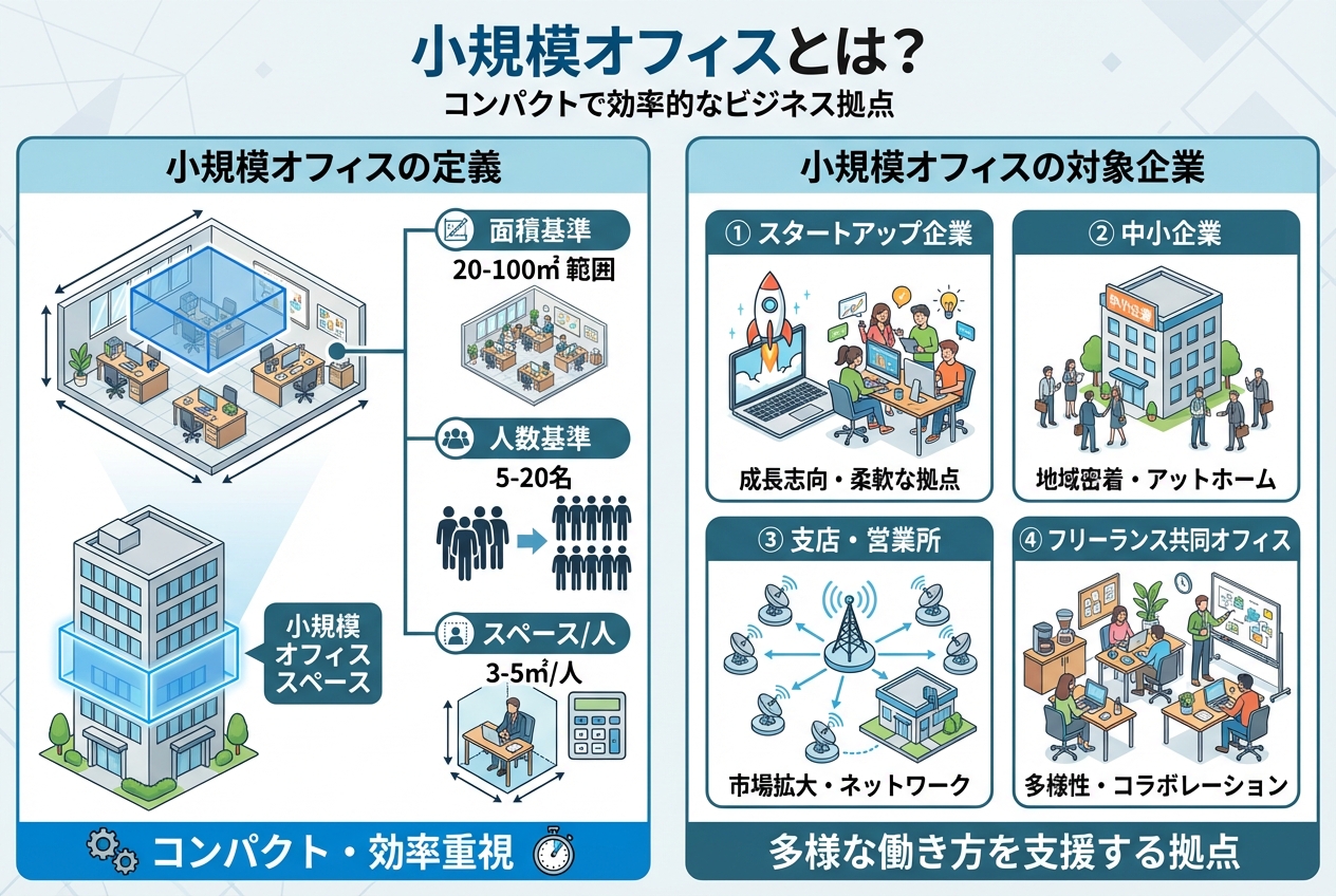 小規模オフィスとは、一般的に従業員数が少ない企業やスタートアップが使用する、比較的コンパクトなオフィススペースのことを指します。小規模オフィスの定義は明確にはありませんが、多くの場合、床面積が数十平方メートルから数百平方メートル程度の範囲が該当します。
