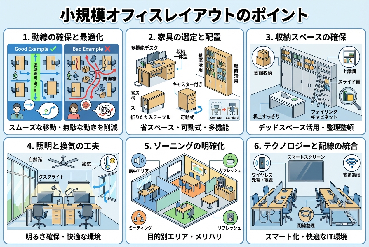 小規模オフィスレイアウトのポイントは、効率的なスペース利用と機能的なデザインです。