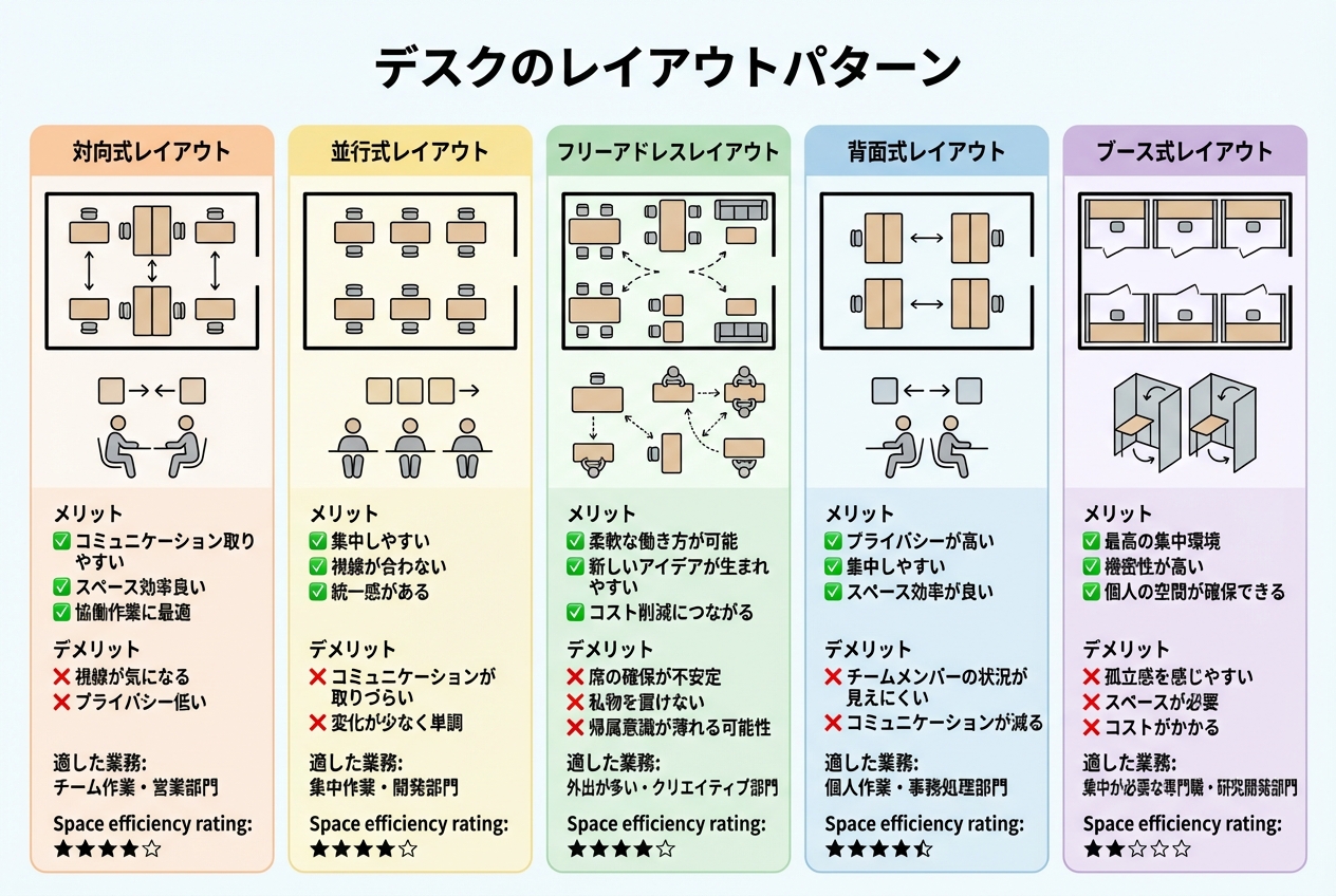 小規模オフィスのレイアウトを考える際、デスクの配置は非常に重要です。そこで、代表的なデスクのレイアウトパターンを詳しく紹介します。