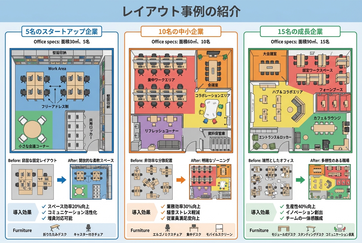 ここでは、小規模オフィスにおける具体的なレイアウト事例を紹介します。さまざまなスタイルと工夫によって、限られたスペースを最大限に活用する方法をご覧いただけます。