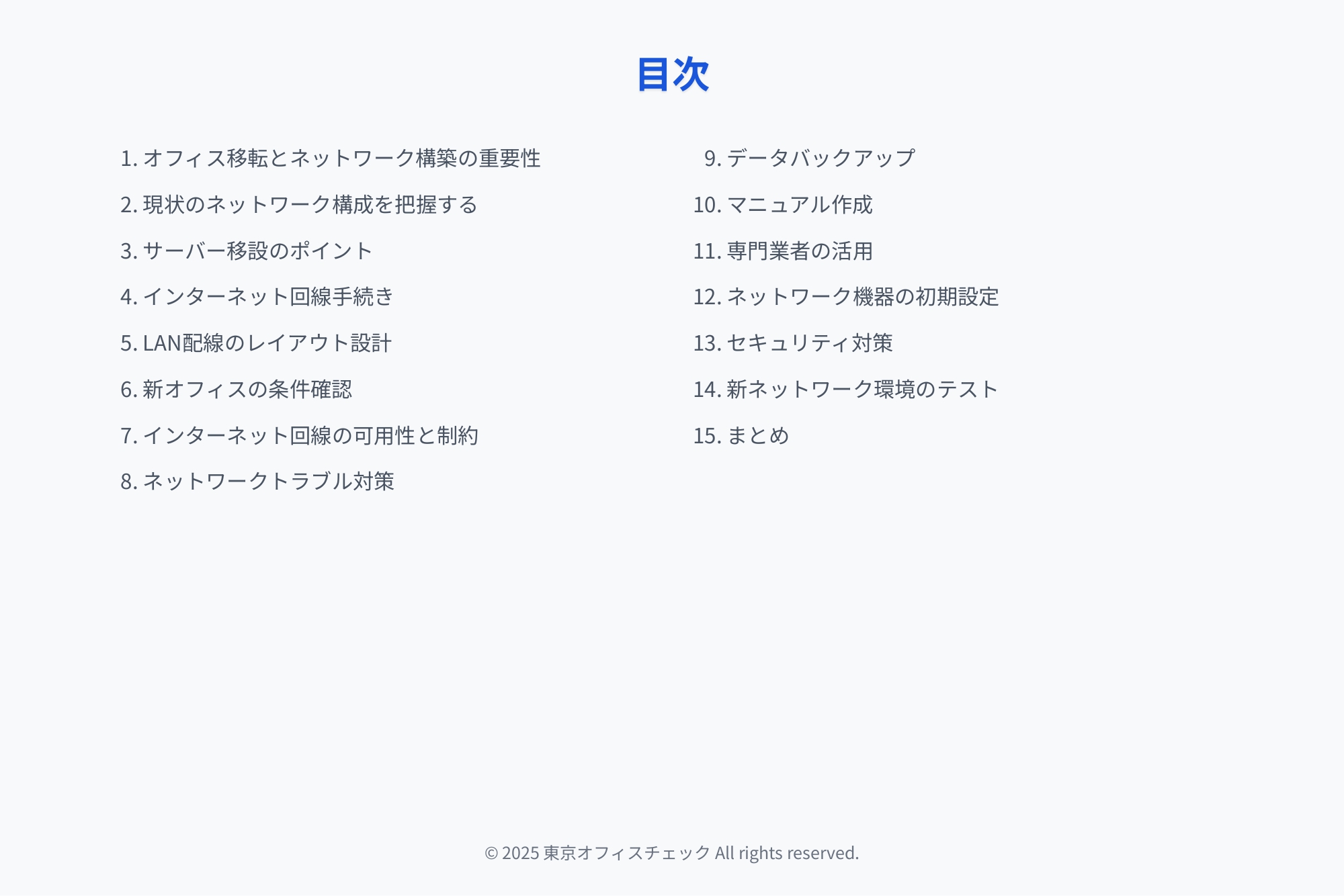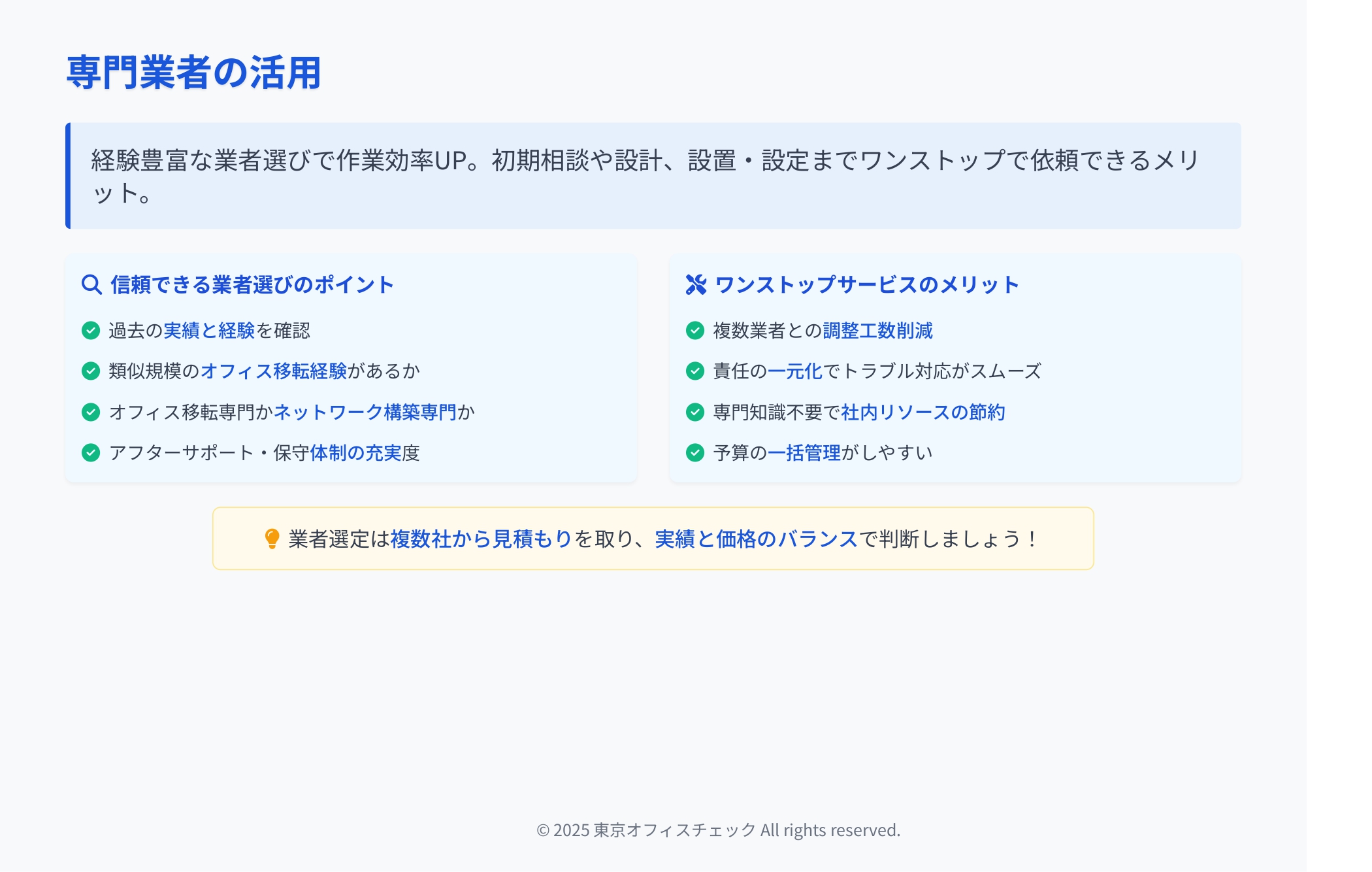 これらの条件を事前に確認し、適切なネットワーク環境を構築することで、移転後のトラブルを未然に防ぐことができます。