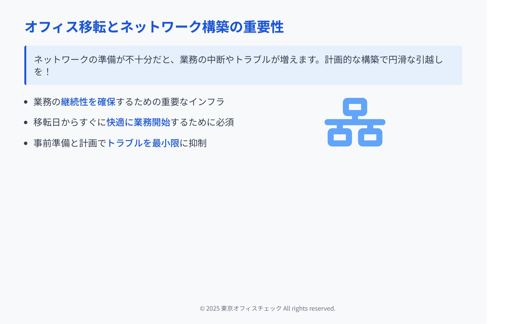 特に、中小企業のオフィスマネージャーやIT部門の担当者が気をつけるべきポイントを中心に、ネットワークトラブルの回避手段から、効率的なインフラの構築方法まで、具体的なアドバイスを提供します。この記事を読むことで、ネットワーク関連のトラブルを未然に防ぎ、オフィス移転後にスムーズに業務を再開できるようになるでしょう。