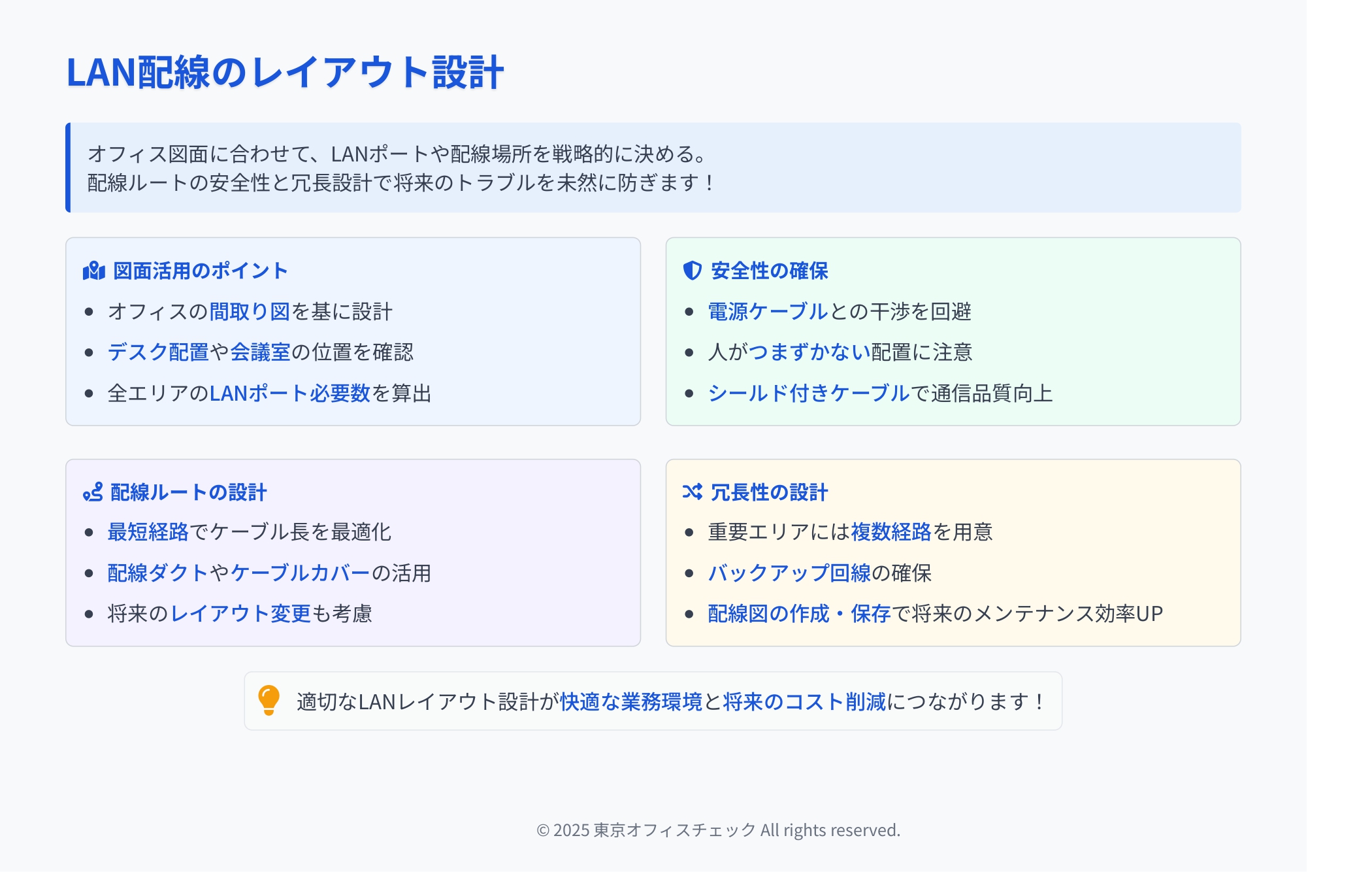 オフィス移転に際して、LAN配線のレイアウト設計は重要な工程です。まず、新しいオフィスの間取り図を用意し、各部屋やエリアの使用目的に応じたLANポートの配置を考えます。社員のデスクや会議室、共用スペースなど、それぞれのエリアで必要な配線をリストアップします。