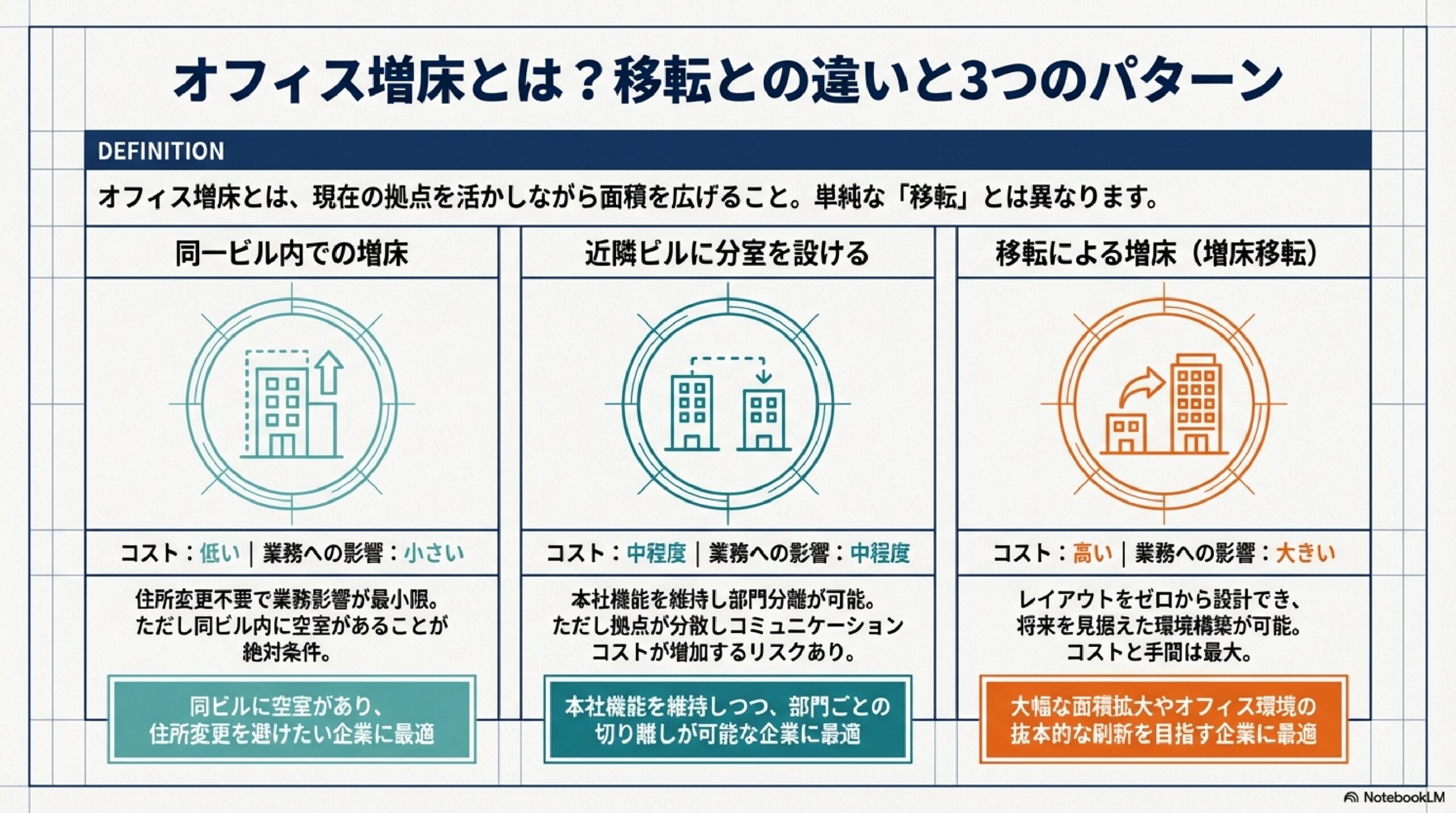 | 同一ビル内増床 | 低い | 小さい | 同ビルに空室あり・住所変更を避けたい |