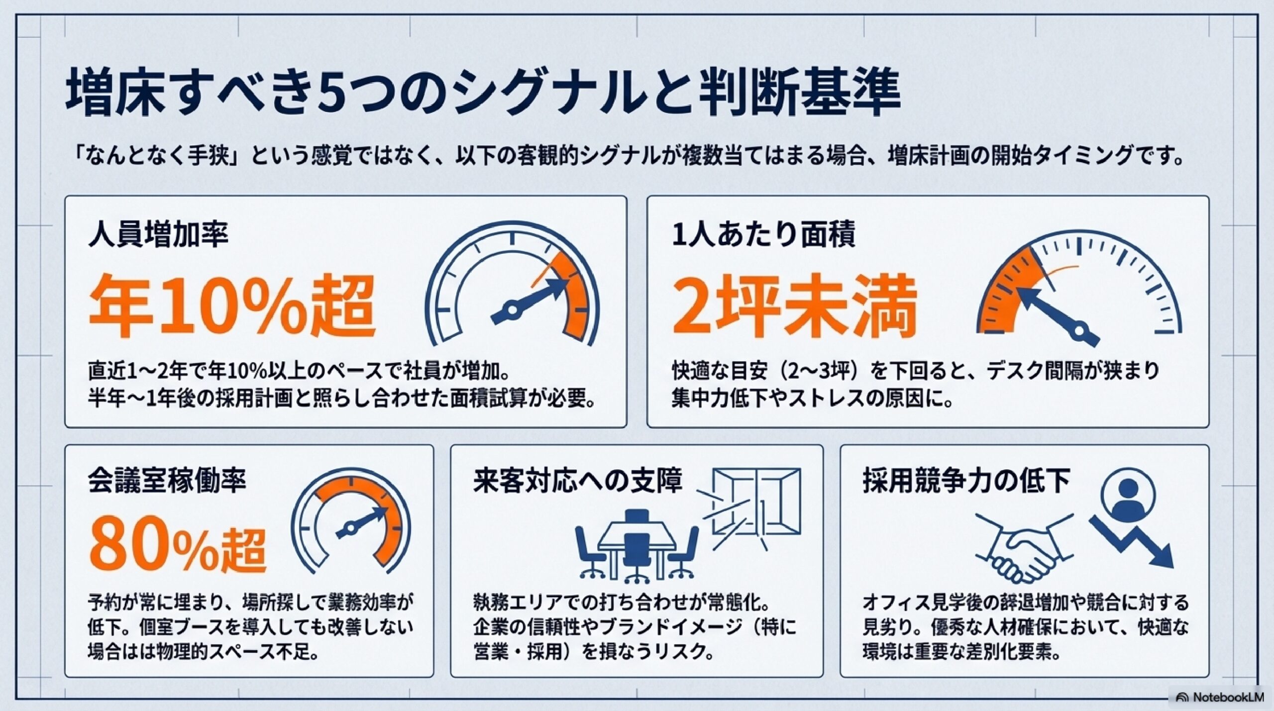 - 人員増加率・1人あたり面積・会議室稼働率・来客対応・採用競争力の5つのシグナルで増床タイミングを判断する
