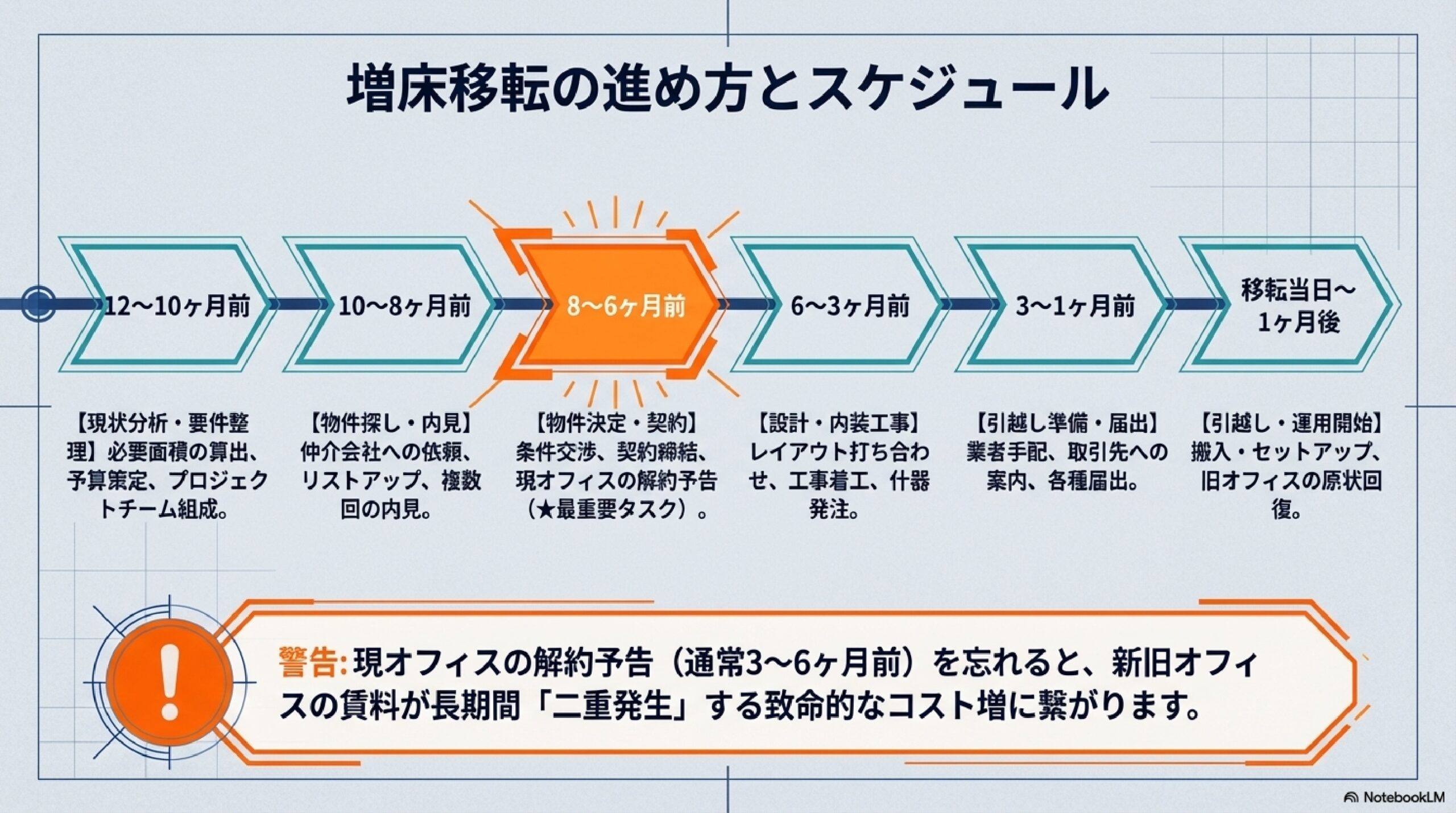 - 増床移転は12ヶ月前からの計画的なスケジュール管理が成功の鍵