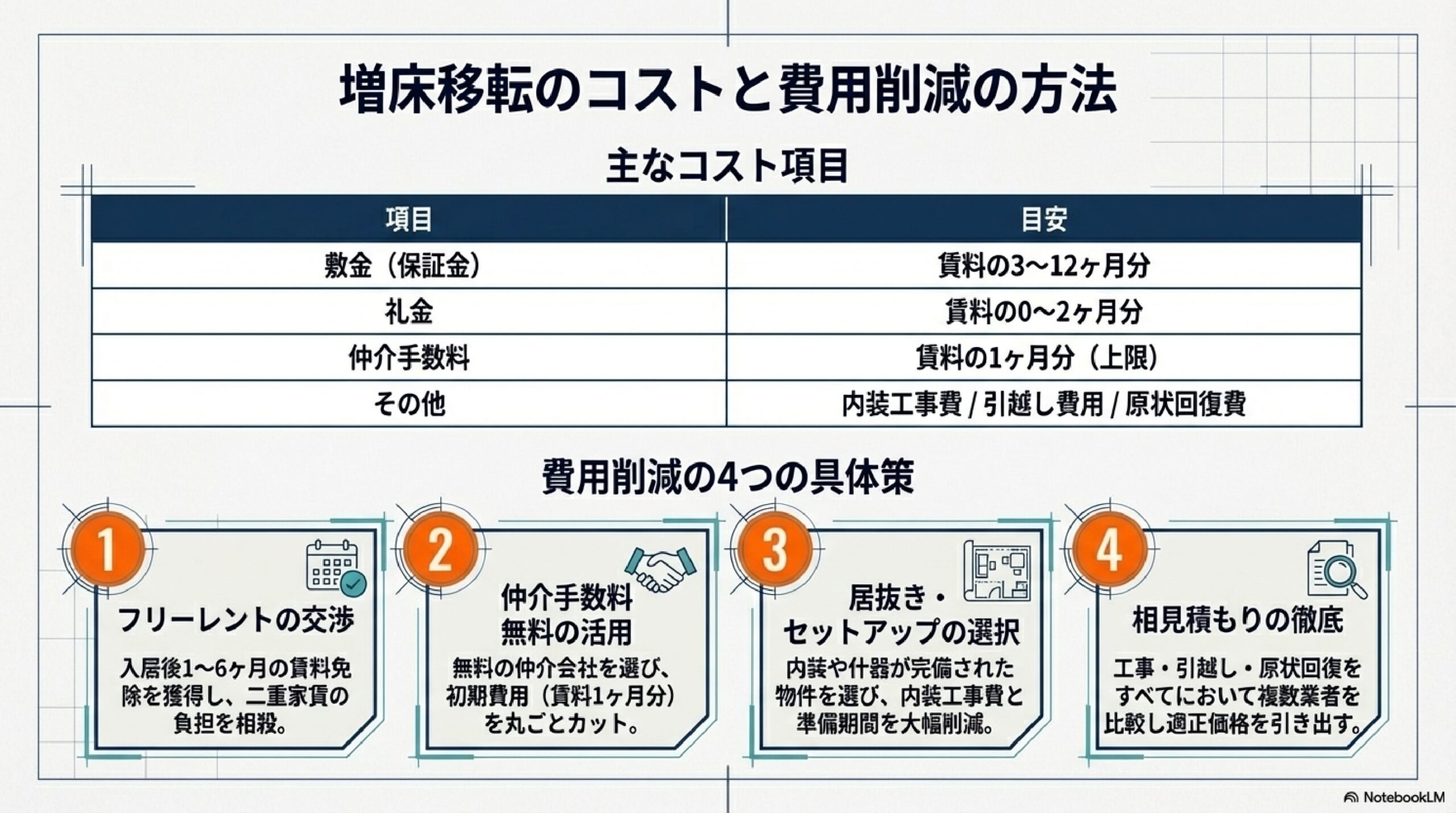 増床移転にかかる主なコスト項目と、それぞれの費用を抑えるための方法を整理します。