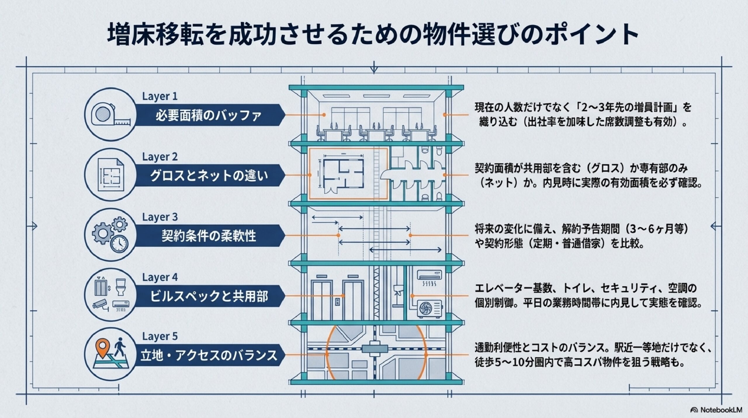 増床移転の物件選びでは、現在の課題を解消するだけでなく、将来の成長にも対応できるかどうかを見極めることが重要です。以下のポイントを押さえて物件を比較検討しましょう。