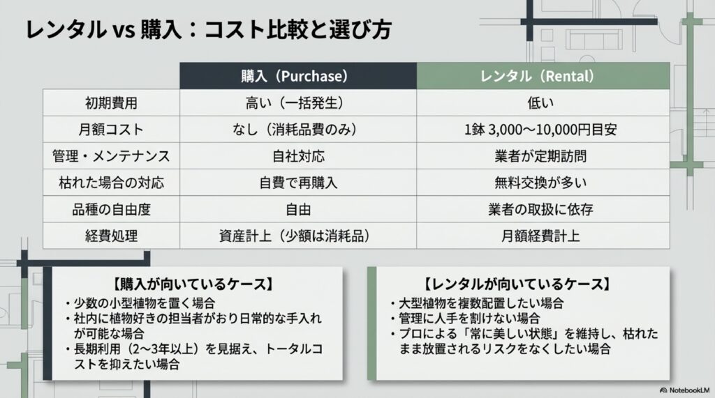 社内に植物好きの社員がいて日常的な水やり・手入れが可能な場合や、少数の小型植物をデスクに置く程度であれば購入のほうがコストを抑えられます。長期的に見れば、2〜3年以上使い続けるなら購入のほうがトータルコストは安くなるケースが多いでしょう。