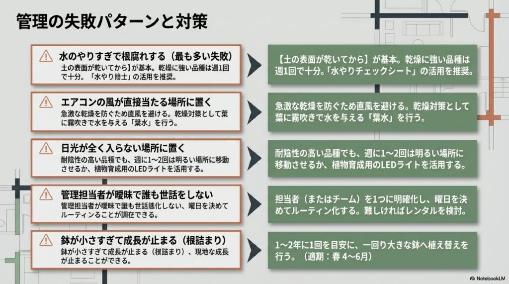 水のやりすぎによる根腐れ、エアコンの直風による乾燥、日光不足、管理担当者の不在が主な原因です。管理ルールを明文化し、水やりの曜日や担当者を決めておくことで多くの失敗を防げます。