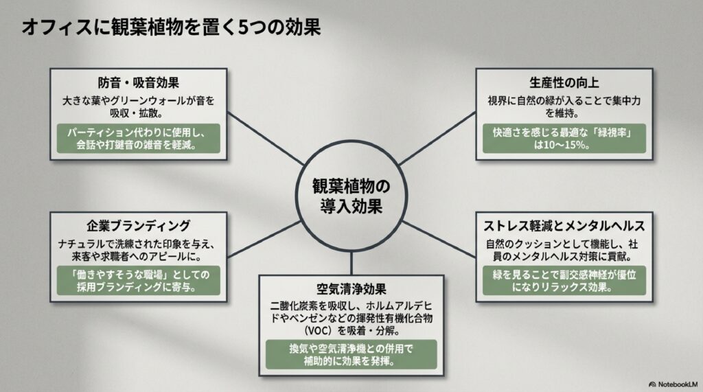 生産性の向上、ストレス軽減、空気清浄、企業ブランディングの向上、防音・吸音効果の5つが主な効果です。視界に緑が入ることで集中力が保ちやすくなり、社員のメンタルヘルス改善にも寄与します。