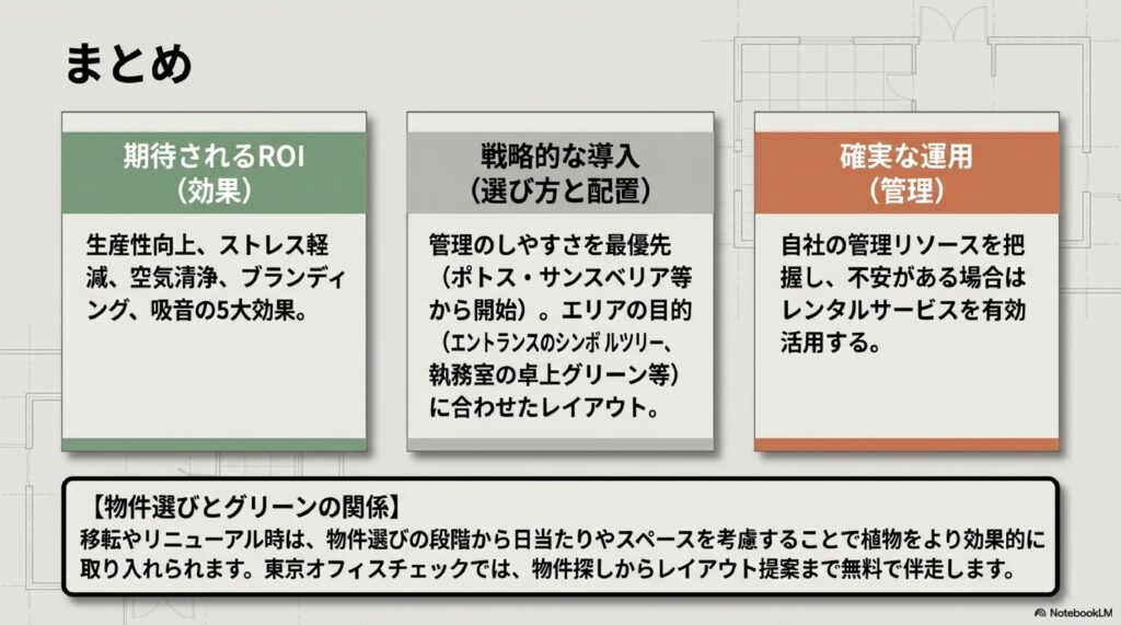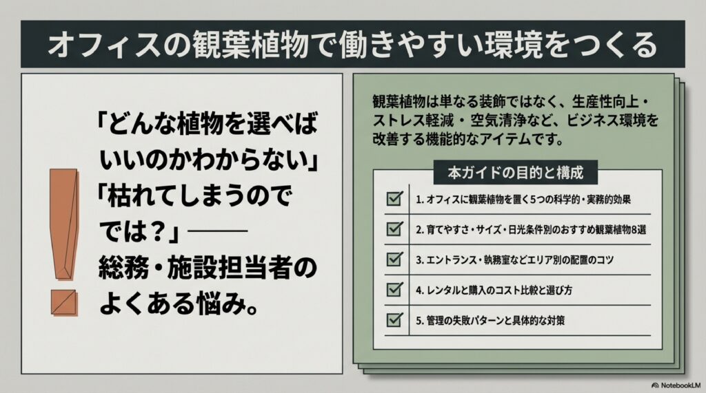 オフィスに観葉植物を導入することで、生産性向上・ストレス軽減・空気清浄・ブランディング・吸音という5つの効果が期待できます。品種選びでは、管理のしやすさを最優先に考え、ポトス・サンスベリア・パキラなど枯れにくい品種から始めるのがおすすめです。