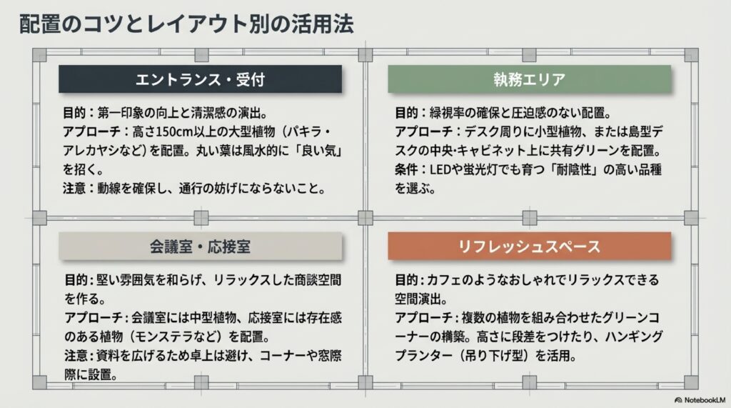 観葉植物はただ置くだけでなく、エリアの特性に合わせて品種・サイズ・配置を計画することで効果が最大化されます。ここでは、オフィスの主要4エリアごとに具体的な配置のポイントを解説します。