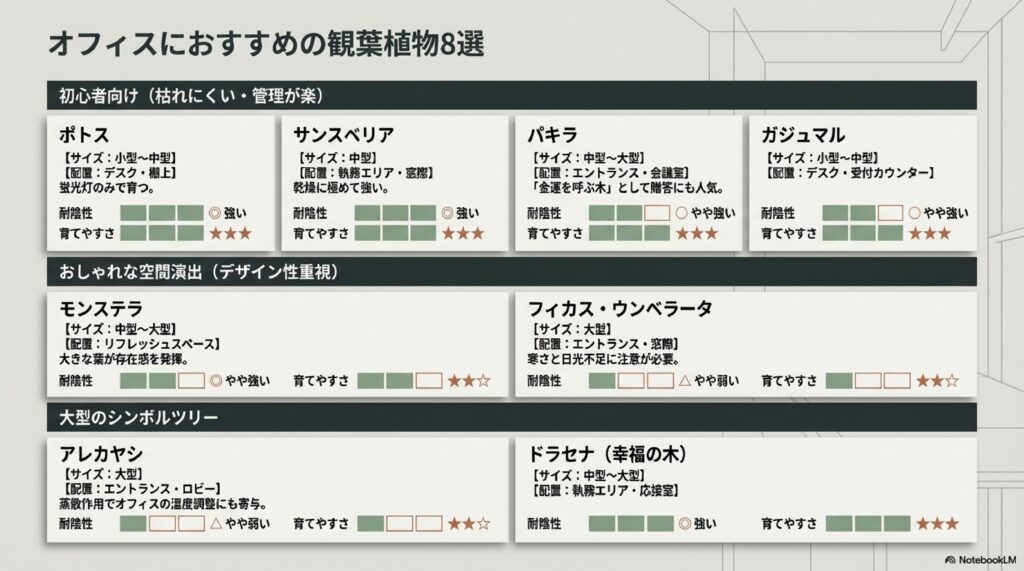 ここでは、オフィス環境に適した観葉植物を育てやすさ・サイズ・耐陰性の観点から8種厳選してご紹介します。