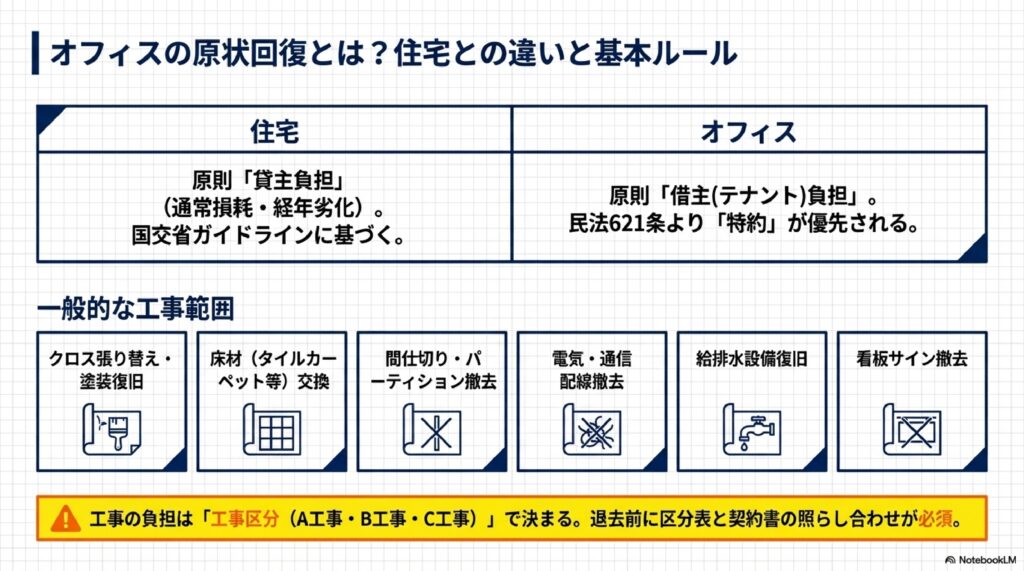 - オフィスの原状回復と住宅の違い、民法621条の基本ルール