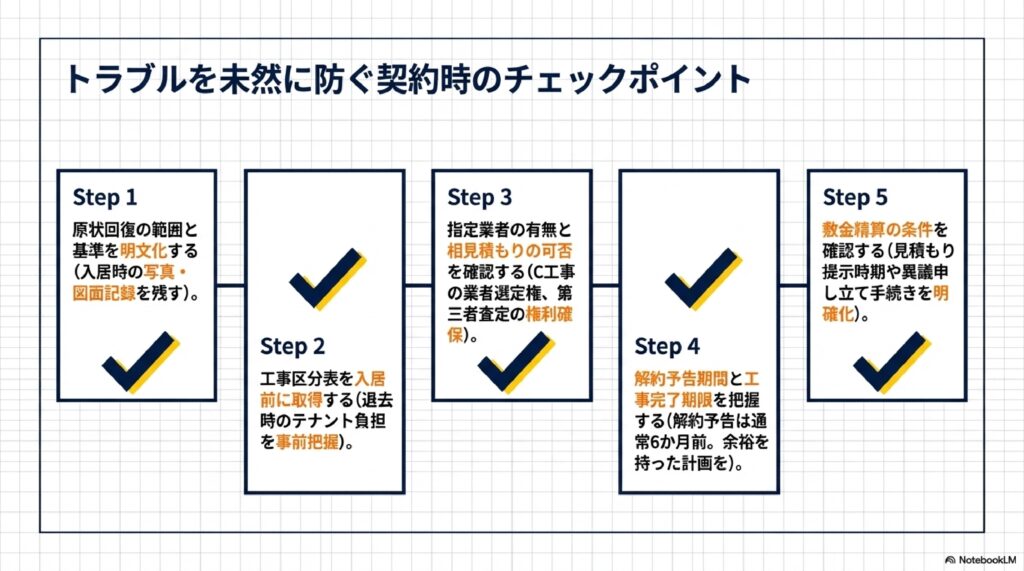 - 入居時に原状回復の範囲・工事区分表・敷金精算条件を必ず確認する