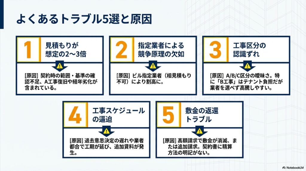 最も多いトラブルが、原状回復費用の見積もりが想定を大幅に上回るケースです。原因としては、契約時に原状回復の範囲や基準を詳細に確認していなかったことが挙げられます。入居時にビル側が行った工事(A工事)の復旧費用まで含まれている場合や、経年劣化による損耗まで借主負担として見積もられている場合があります。