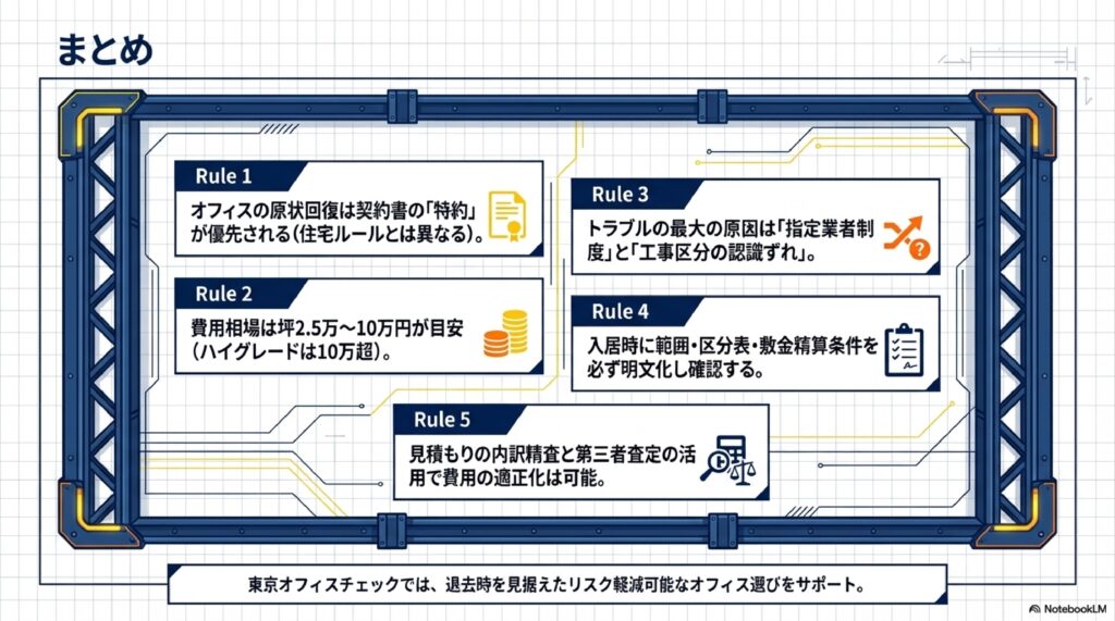 オフィスの原状回復は、適正な知識と事前準備があれば不要なコストを抑えることができます。本記事のポイントを整理します。