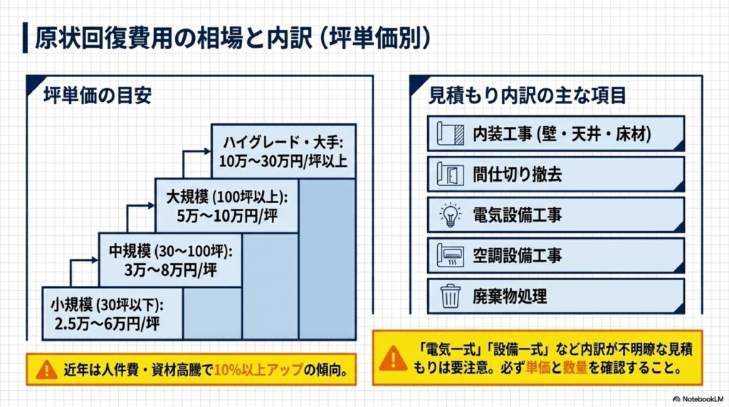 オフィスの原状回復費用は、ビルのグレードや所在地、オフィスの規模によって大きく異なります。ここでは坪単価別の費用相場と、見積もり内訳の見方を解説します。