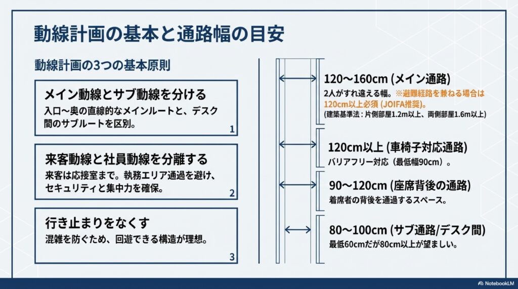 動線計画で特に重要なのが通路幅の確保です。日本オフィス家具協会(JOIFA)では、避難経路にもなるメイン通路の幅を120cm以上にすることを推奨しています。具体的な目安は以下のとおりです。