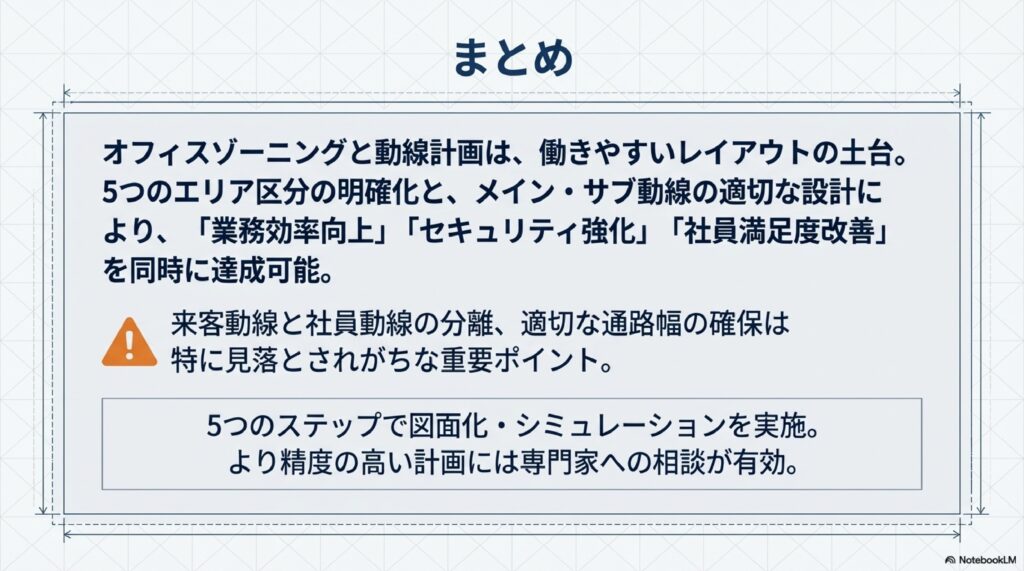 オフィスゾーニングと動線計画は、働きやすいオフィスレイアウトを実現するための土台となる取り組みです。5つのエリア区分を明確にし、メイン動線・サブ動線を適切に設計することで、業務効率の向上、セキュリティの強化、社員満足度の改善を同時に達成できます。