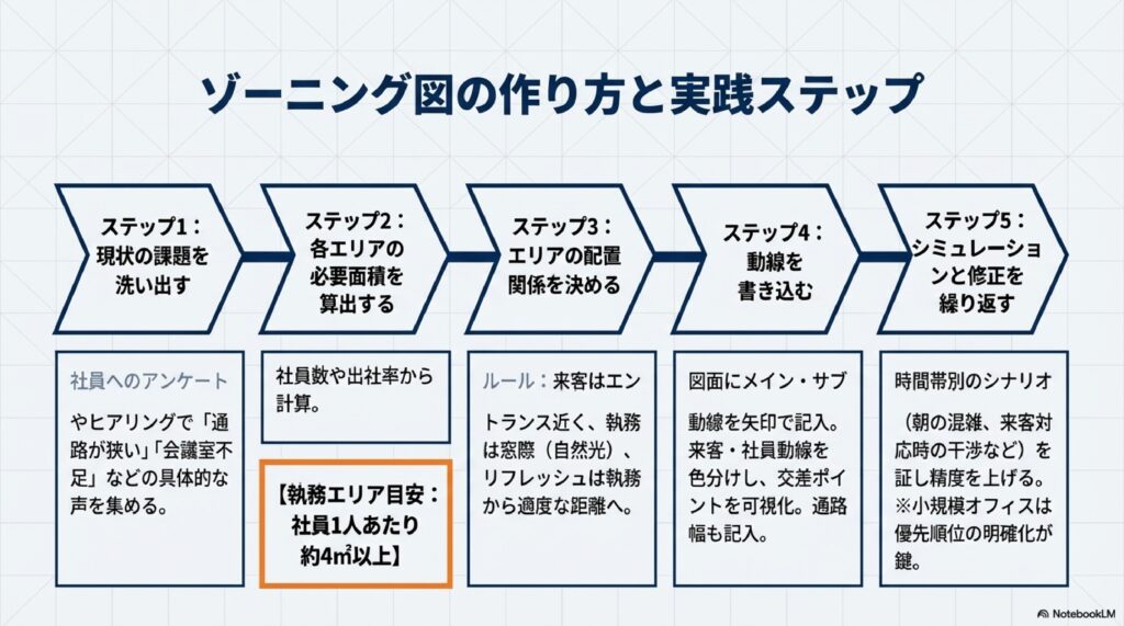 ゾーニングの基本知識を押さえたら、実際にゾーニング図を作成してみましょう。ゾーニング図とは、オフィスのフロア図面にエリア区分と動線を書き込んだ計画図のことです。以下の5つのステップで進めます。