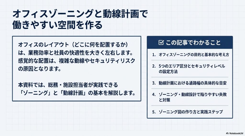 そこで重要になるのが「ゾーニング」と「動線計画」の2つの考え方です。本記事では、オフィスゾーニングの基本から具体的なエリア区分、通路幅の目安、よくある失敗パターン、そしてゾーニング図の作成ステップまで、総務・施設担当者の方がすぐ実践できる形で解説します。