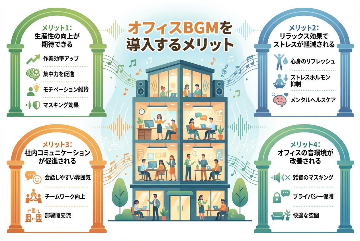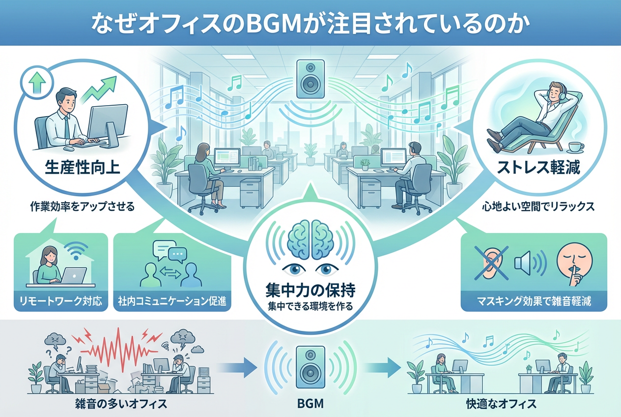 オフィスBGMの導入による職場環境の改善や生産性向上に興味はありませんか。リモートワークや多様な働き方が広がる中、ストレス軽減や社内コミュニケーション促進を求めてBGMの活用を検討する方も多いのではないでしょうか。