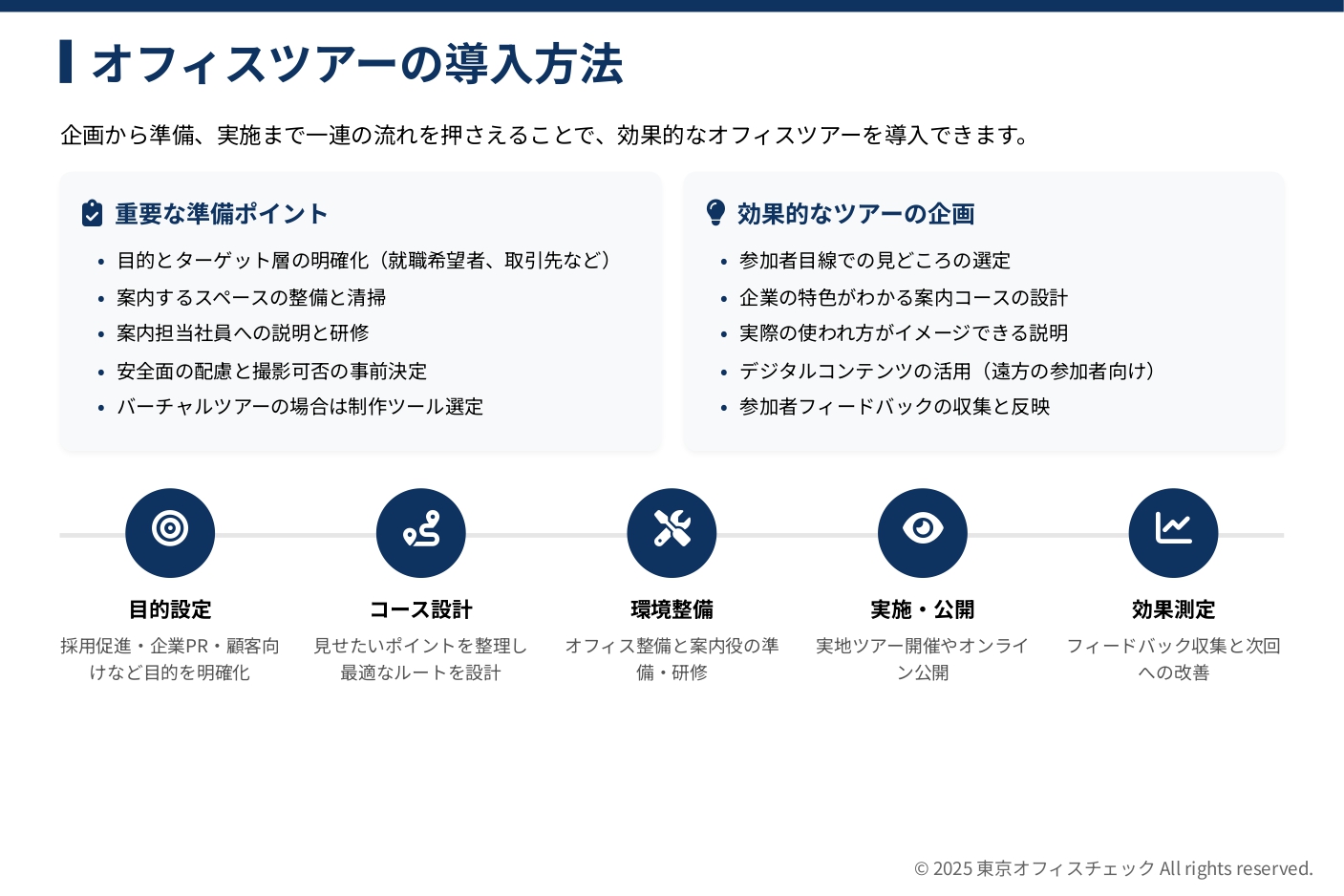企画から準備、実施まで一連の流れを押さえることで、効果的なオフィスツアーを導入できます。