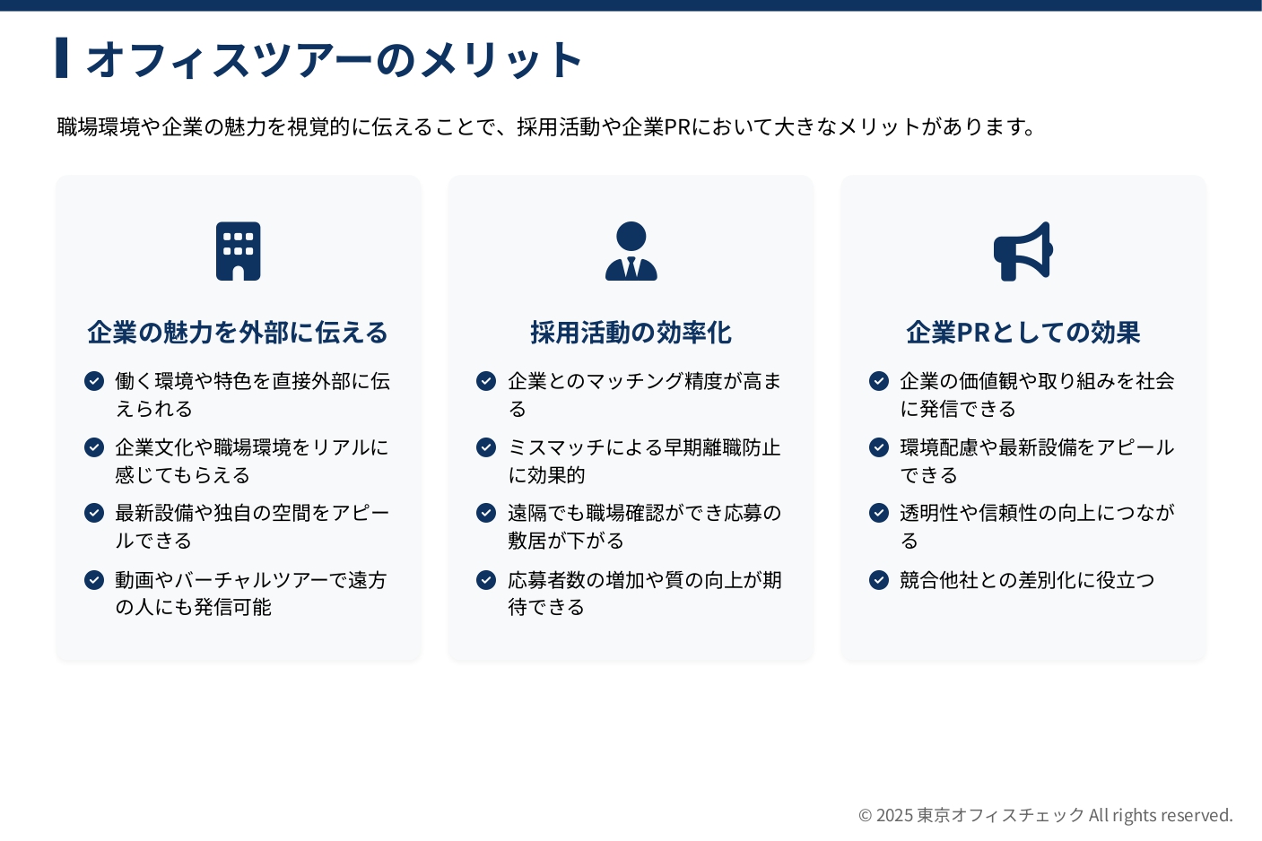 職場環境や企業の魅力を視覚的に伝えることで、採用活動や企業PRにおいて大きなメリットがあります。