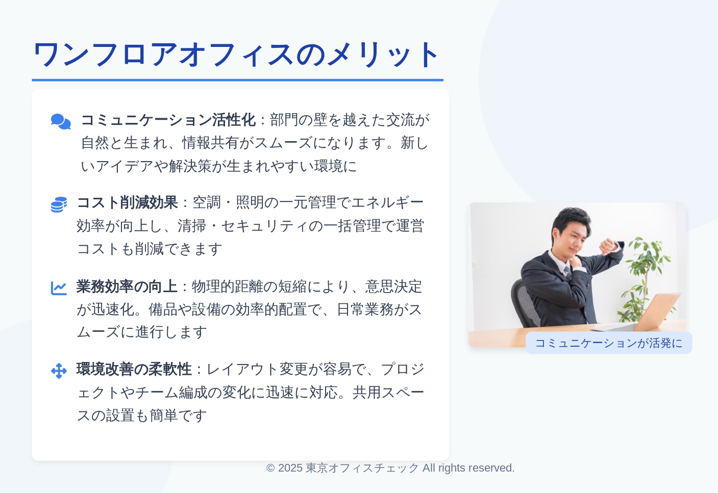 このように、ワンフロアオフィスはチーム全体の連携を強化し、職場の一体感を高める効果があります。