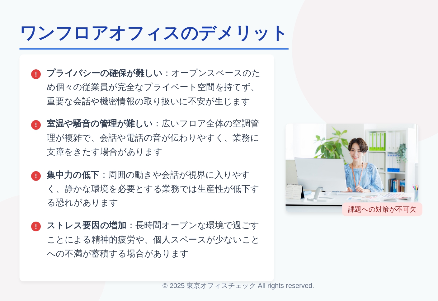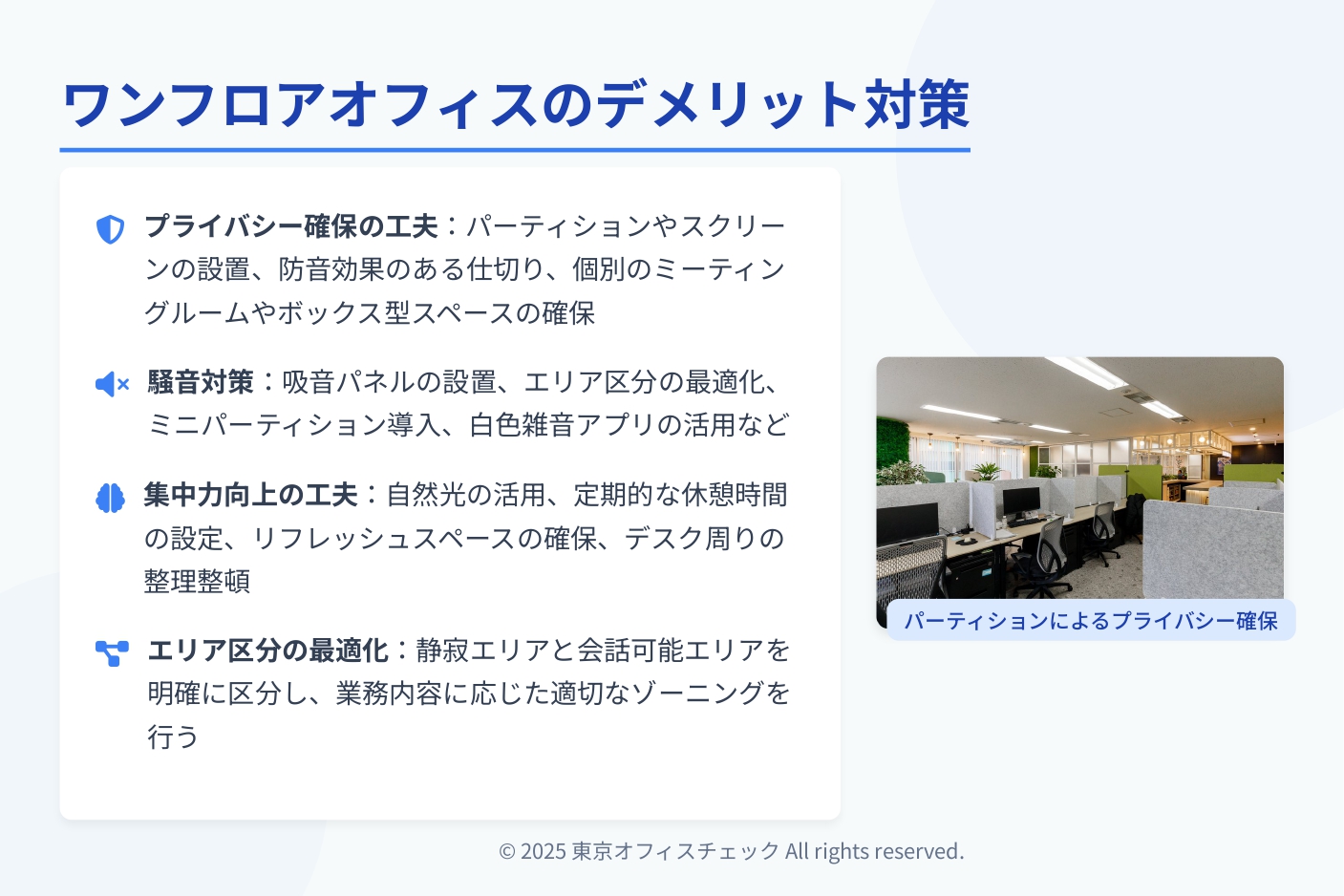 ワンフロアオフィスのデメリットを軽減するためには、プライバシーや騒音、集中力を意識した対策が必要です。