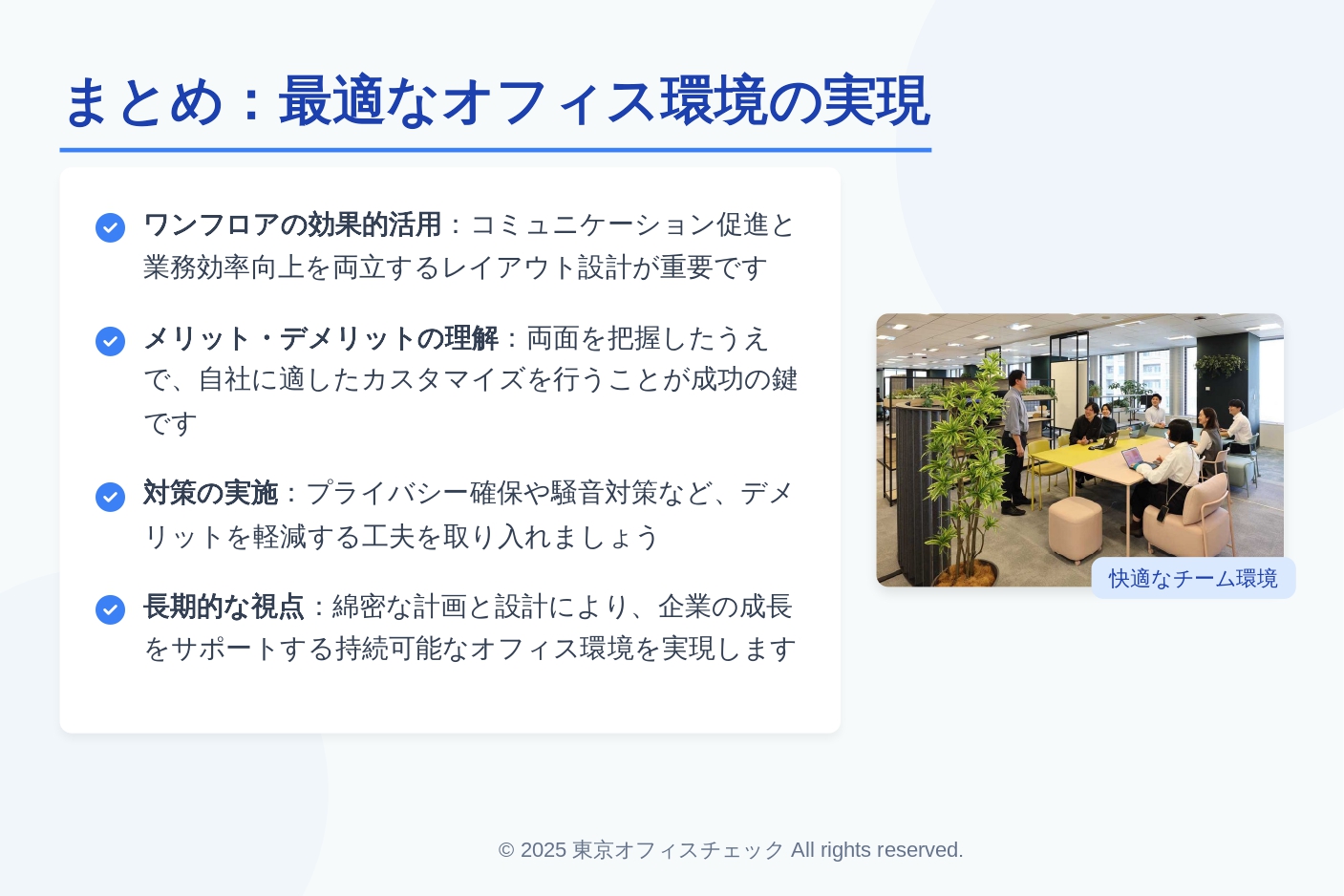 ワンフロアオフィスには、多くのメリットがあります。これらのポイントを押さえることで、より効果的なオフィス運営が可能になります。