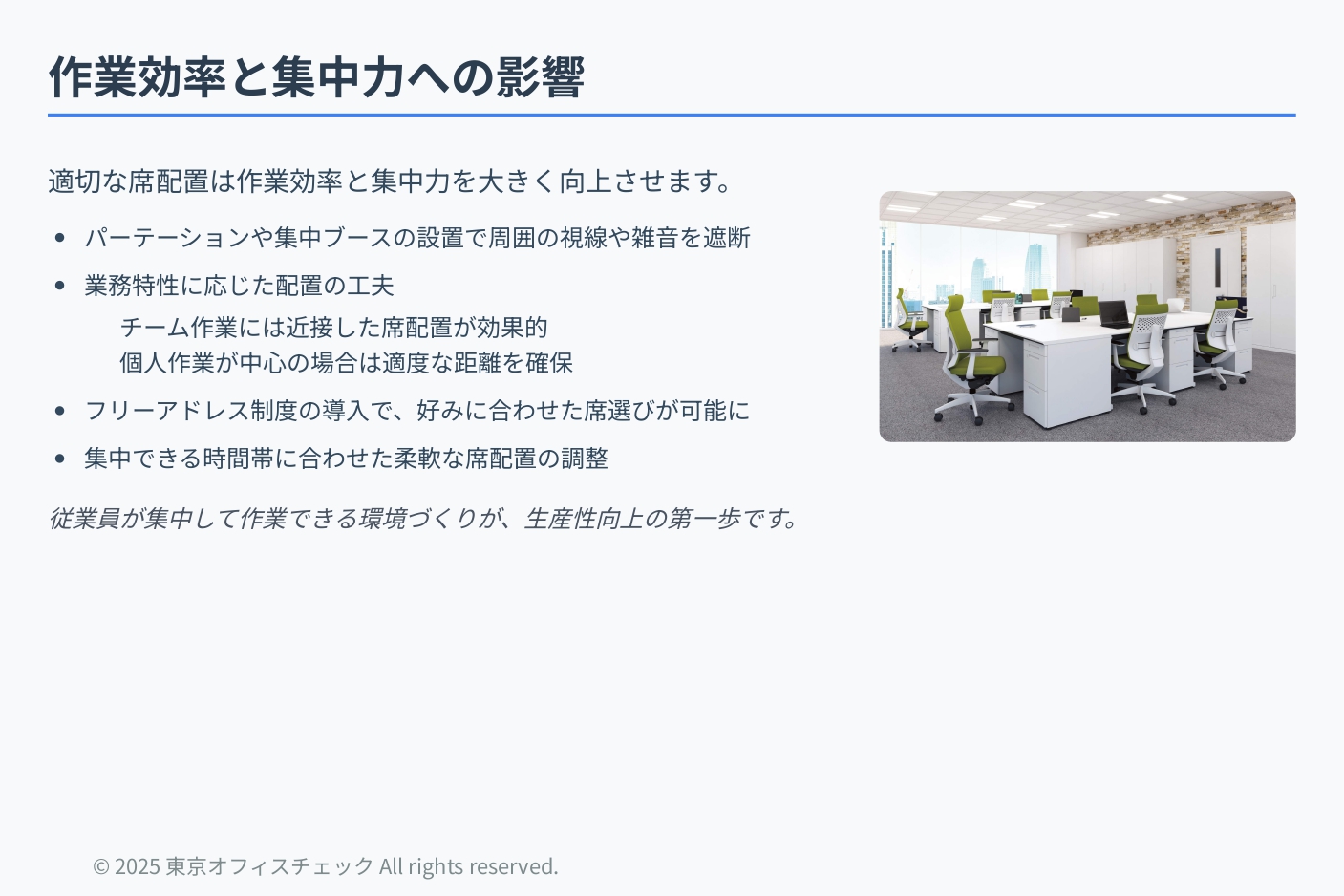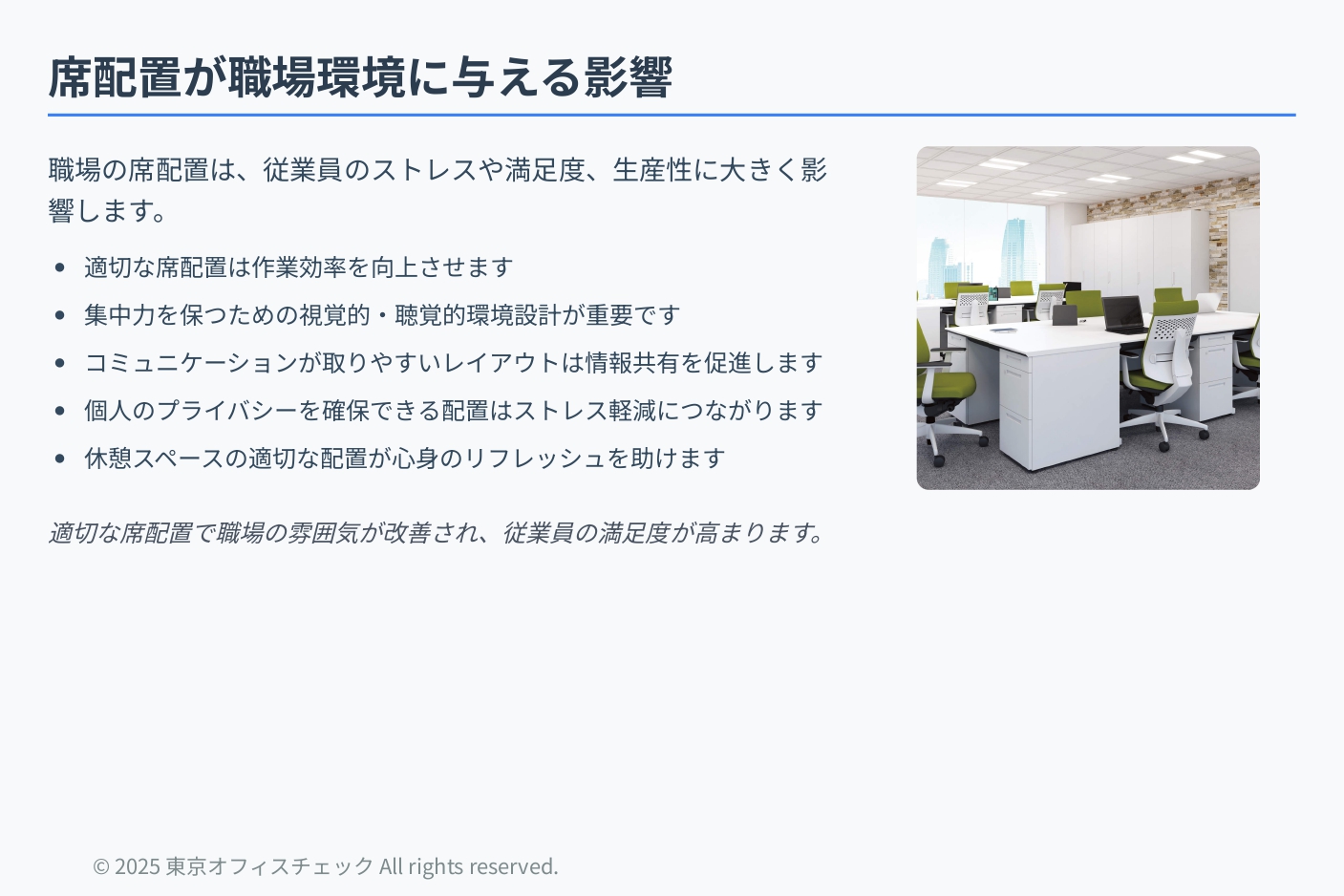 職場の席配置は従業員の生産性やストレスレベルに直接影響を与えます。効率的なオフィスレイアウトは快適な作業環境を提供し、従業員の集中力向上とコミュニケーションの円滑化を促します。