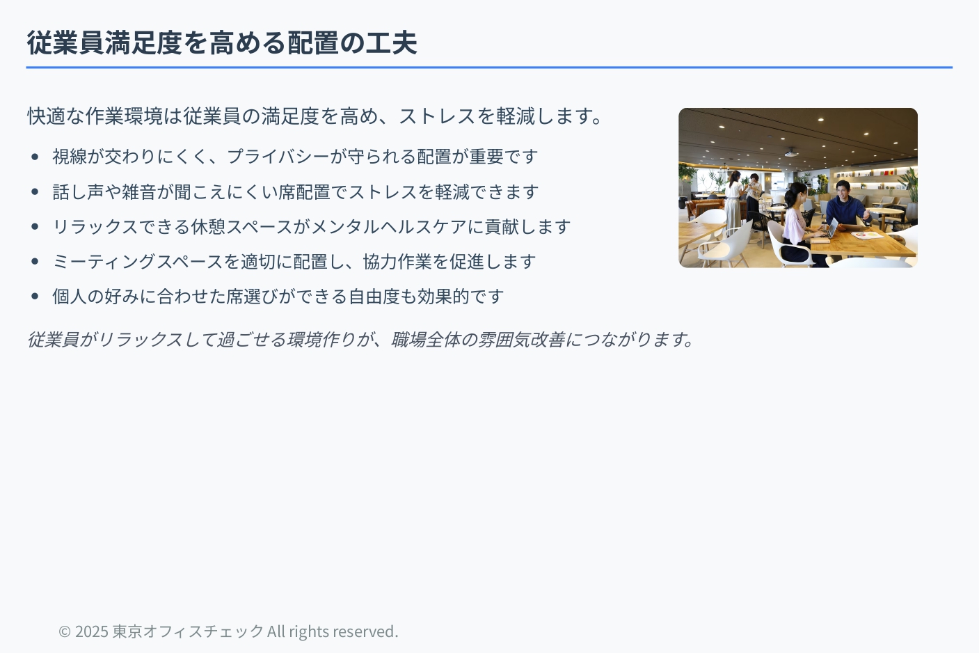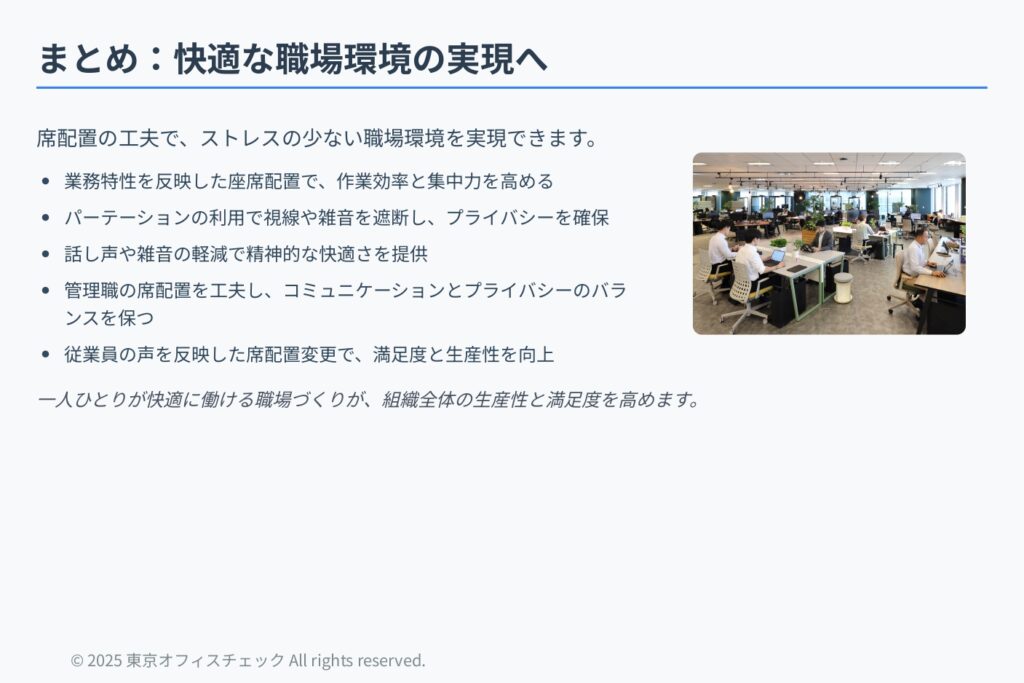 これらを踏まえた席配置の改善方法を導入することで、職場環境全体が向上し、快適な働き方が実現します。