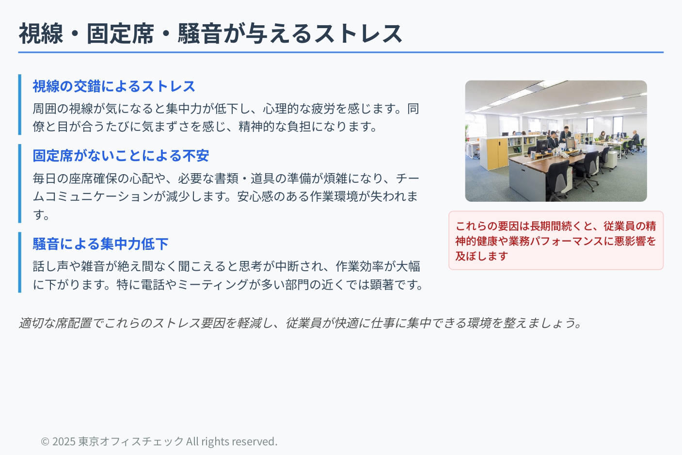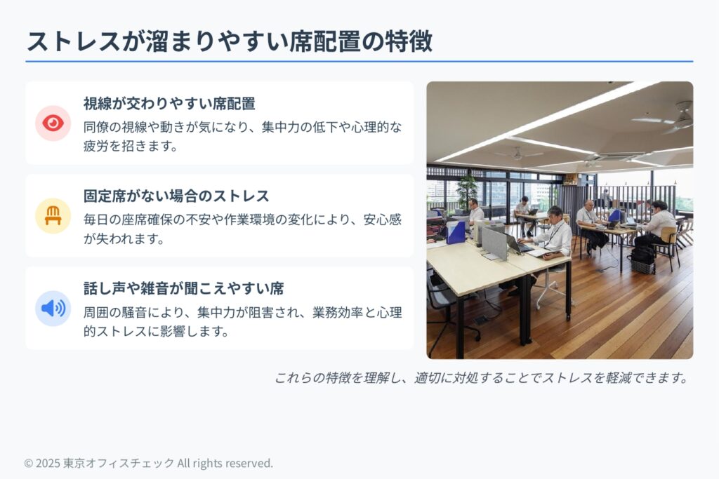 職場の席配置には、ストレスが溜まりやすい特徴があります。例えば、視線が交わりやすい席や固定席がない場合、さらには話し声や雑音が頻繁に聞こえる席などです。