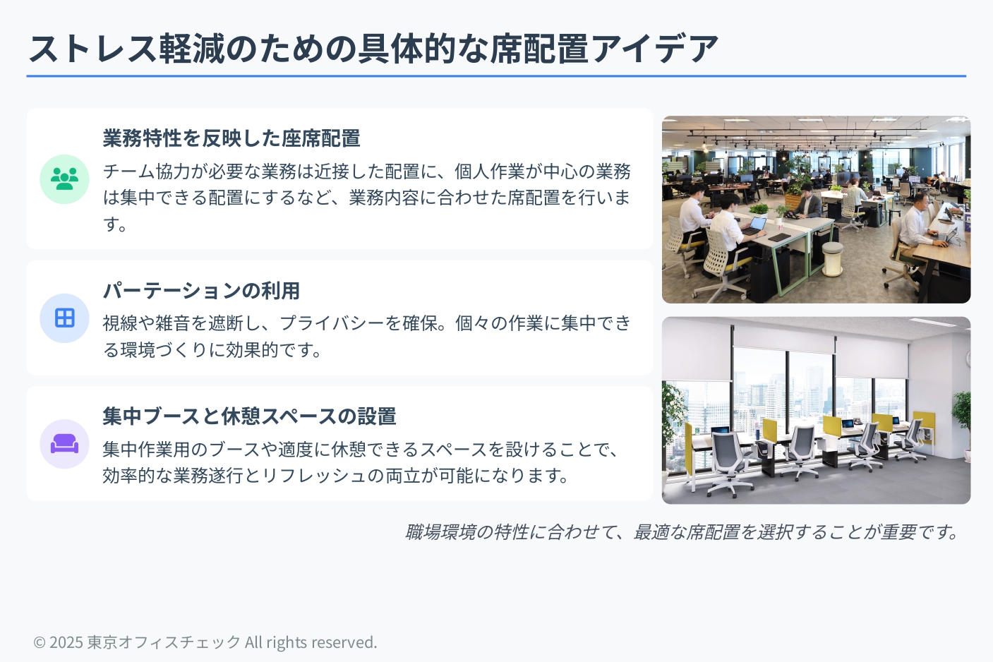 職場のストレスを軽減するためには、業務の特性に合った座席配置やパーテーションの活用、集中ブースや休憩スペースの導入が有効です。
